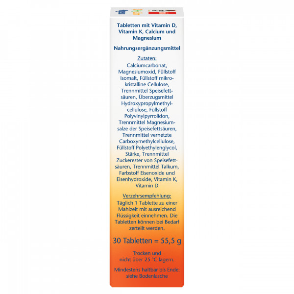 Calciumcarbonat, Magnesiumoxid, Füllstoff Isomalt, Füllstoff mikrokristalline Cellulose, Trennmittel Speisefettsäuren, Überzugsmittel Hydroxypropylmethylcellulose, Füllstoff Polyvinylpyrrolidon, Trennmittel Magnesiumsalze der Speisefettsäuren, Trennmittel vernetzte Carboxymethylcellulose, Füllstoff Polyethylenglycol, Stärke, Trennmittel Zuckerester von Speisefettsäuren, Trennmittel Talkum, Farbstoff Eisenoxide und Eisenhydroxide, Vitamin K, Vitamin D
