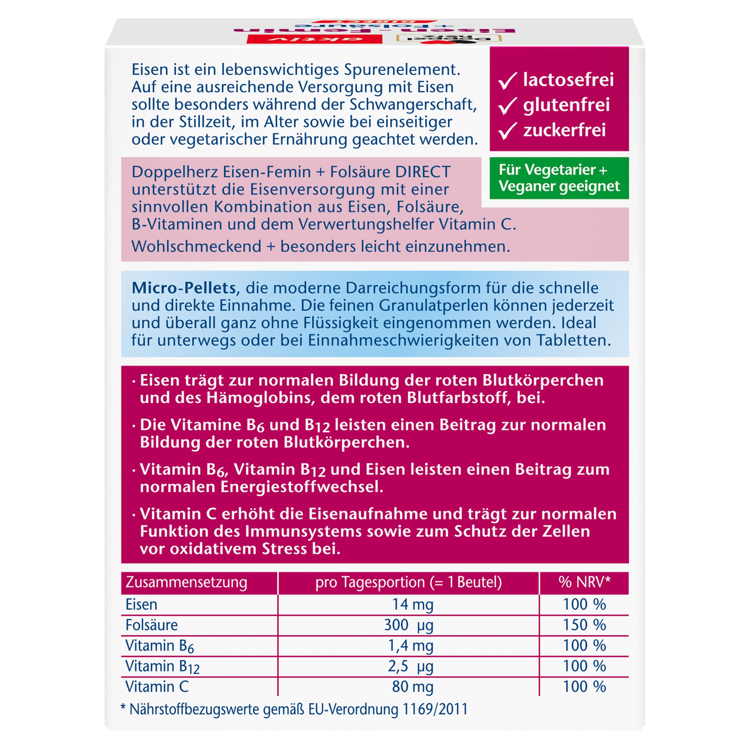 Das Spurenelement Eisen wird für viele Funktionen des Körpers benötigt. Da der Organismus selbst allerdings kein Eisen bilden kann, ist es wichtig, dass wir genügend eisenhaltige Nahrung zu uns nehmen. Die Micro-Pellets von Doppelherz enthalten 14 mg Eisen. Eisen unterstützt den Energiestoffwechsel und trägt zur normalen Bildung von roten Blutkörperchen bei. Das enthaltene Vitamin C steigert die Aufnahme von Eisen und unterstützt zudem die normale Funktion des Immunsystems. Die Vitamine B6 und B12 leisten darüber hinaus einen Beitrag zum normalen Energiestoffwechsel. Die wohlschmeckenden Pellets mit Waldfrucht-Geschmack können ganz ohne Wasser direkt auf die Zunge gegeben und geschluckt werden. Schnell und einfach auch für unterwegs!