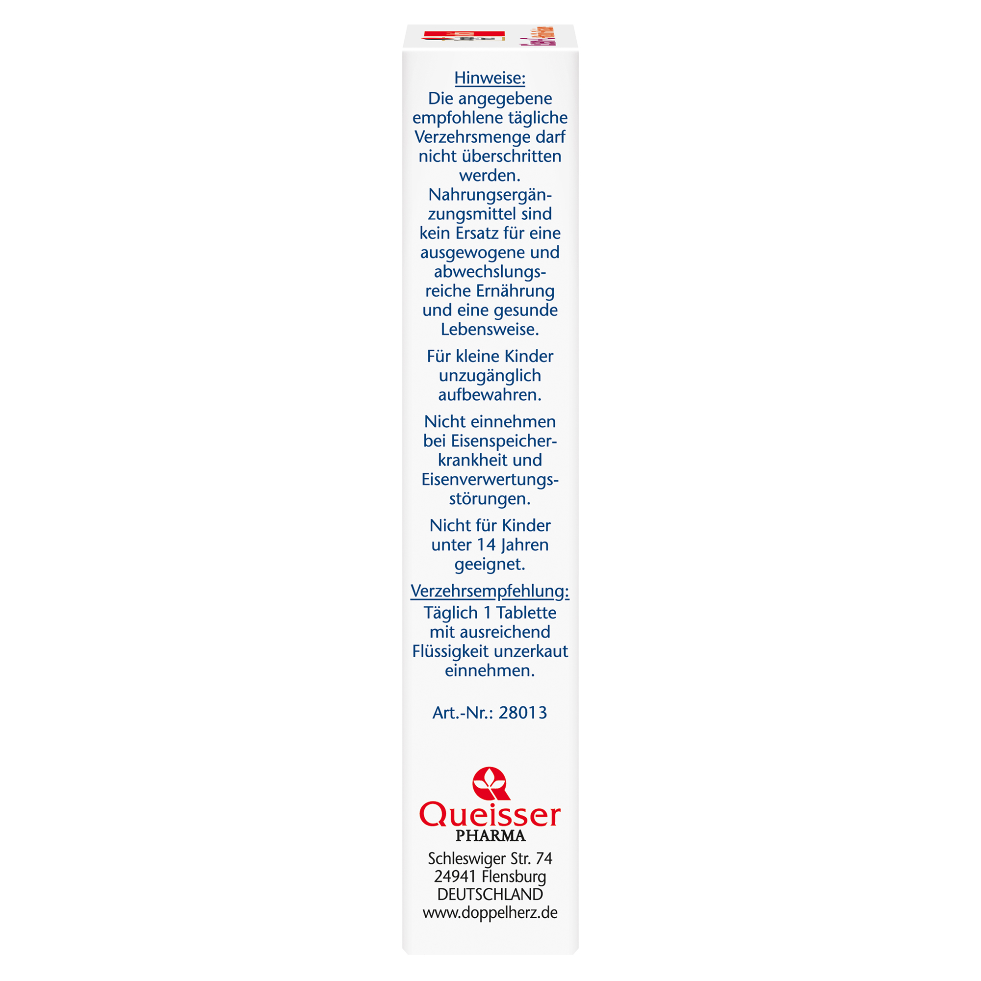 DoppelherzNahrungsergänzungsmittel sind kein Ersatz für eine ausgewogene und abwechslungsreiche Ernährung und eine gesunde Lebensweise. Die angegebene empfohlene tägliche Verzehrsmenge darf nicht überschritten werden. Außerhalb der Reichweite von kleinen Kindern aufbewahren.