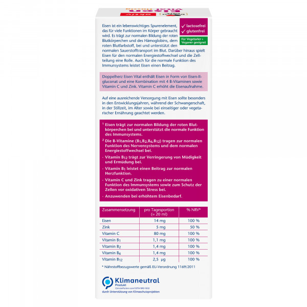 DoppelherzNahrungsergänzungsmittel sind kein Ersatz für eine ausgewogene und abwechslungsreiche Ernährung und eine gesunde Lebensweise. Die angegebene empfohlene tägliche Verzehrsmenge darf nicht überschritten werden. Außerhalb der Reichweite von kleinen Kindern aufbewahren.