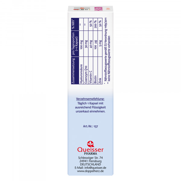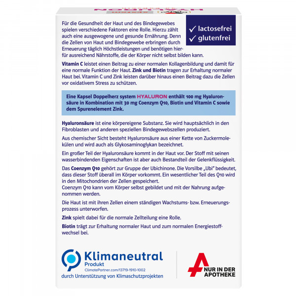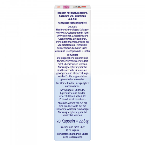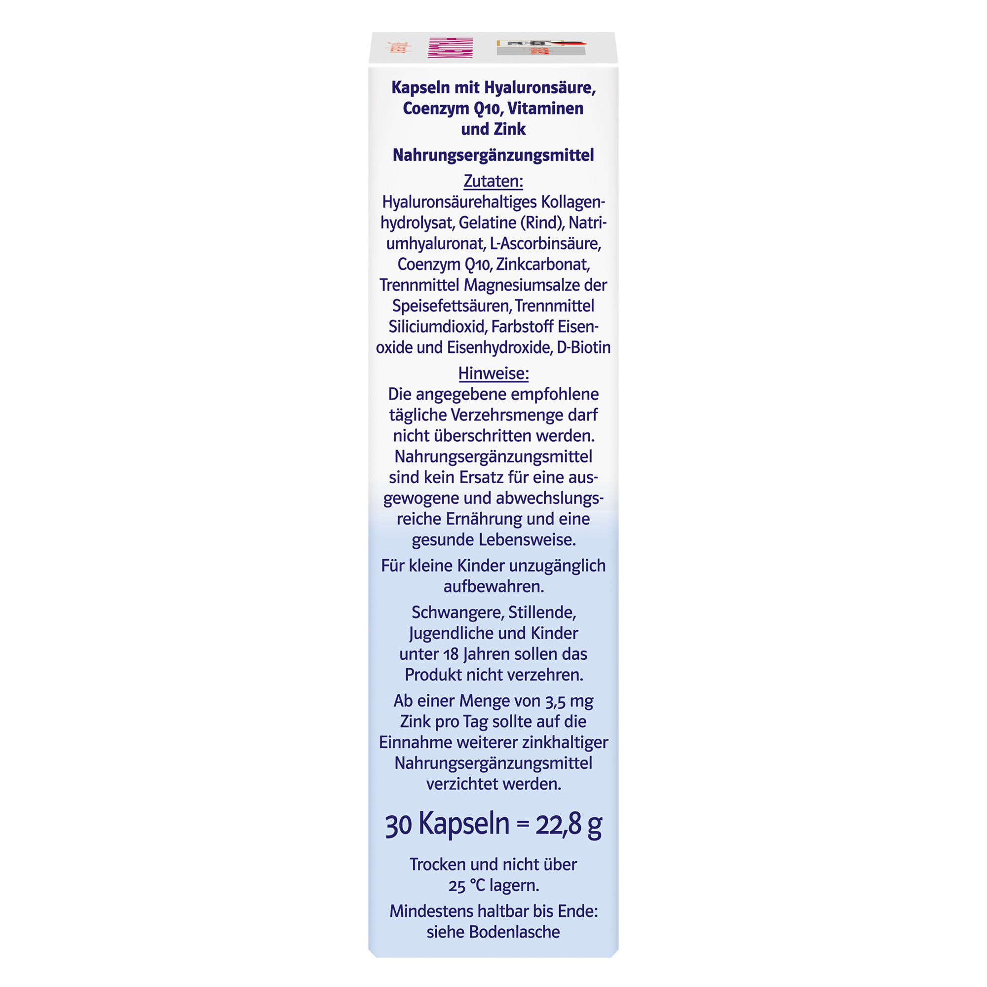 • Mit 100 mg Hyaluronsäure und 30 mg Coenzym Q10 pro Tagesportion (1 Kapsel)