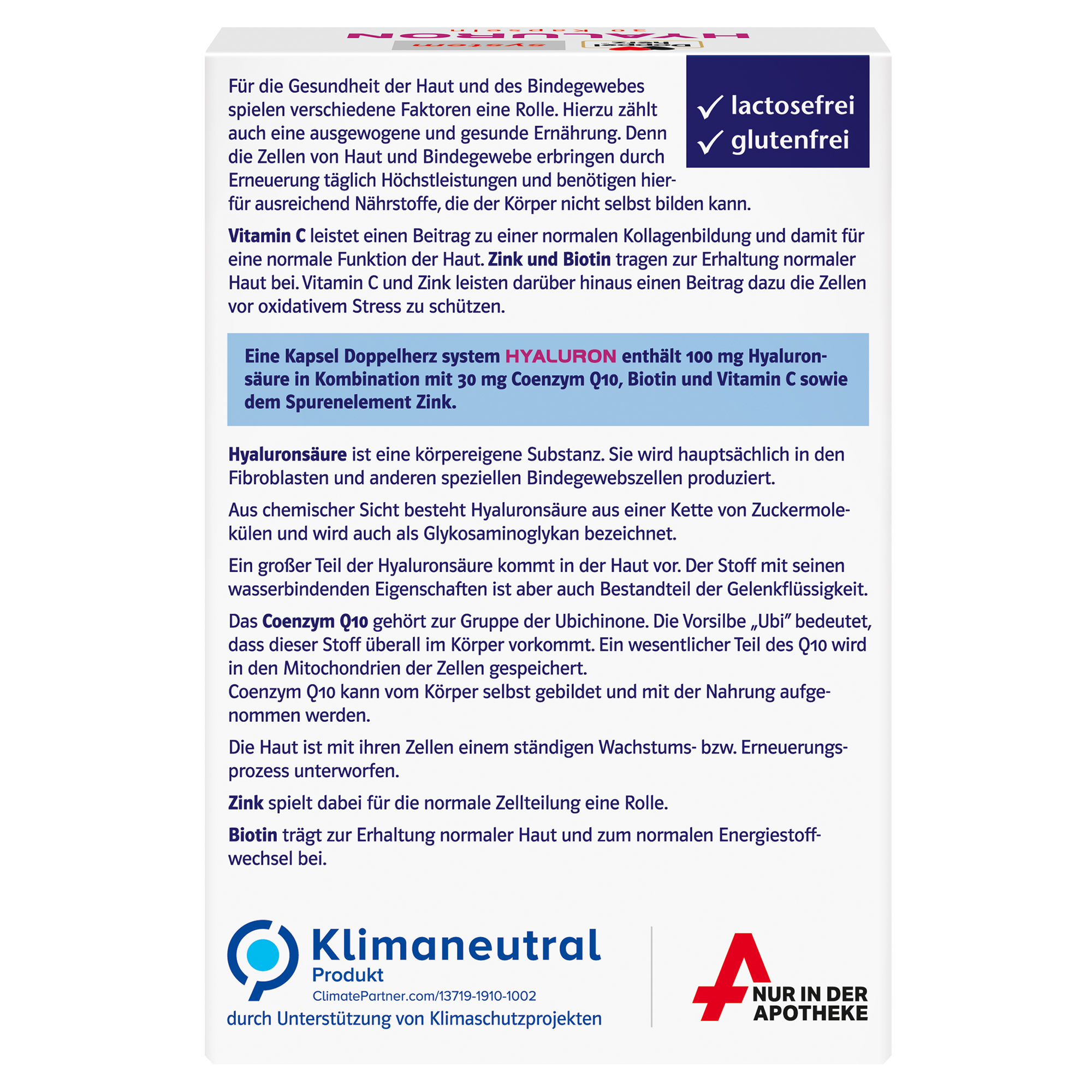 Eine Kapsel Doppelherz system HYALURON enthält 100 mg Hyaluronsäure in Kombination mit 30 mg Coenzym Q10, Biotin und Vitamin C sowie dem Spurenelement Zink. Hyaluronsäure ist eine körpereigene Substanz. Sie wird hauptsächlich in den Fibroblasten und anderen speziellen Bindegewebszellen produziert. Aus chemischer Sicht besteht Hyaluronsäure aus einer Kette von Zuckermolekülen und wird auch als Glykosaminoglykan bezeichnet. Ein großer Teil der Hyaluronsäure kommt in der Haut vor. Der Stoff mit seinen wasserbindenden Eigenschaften ist aber auch Bestandteil der Gelenkflüssigkeit. Das Coenzym Q10 gehört zur Gruppe der Ubichinone. Die Vorsilbe „Ubi“ bedeutet, dass dieser Stoff überall im Körper vorkommt. Ein wesentlicher Teil des Q10 wird in den Mitochondrien der Zellen gespeichert. Coenzym Q10 kann vom Körper selbst gebildet und mit der Nahrung aufgenommen werden. Die Haut ist mit ihren Zellen einem ständigen Wachstums- bzw. Erneuerungsprozess unterworfen. Zink spielt dabei für die normale Zellteilung eine Rolle. Biotin trägt zur Erhaltung normaler Haut und zum normalen Energiestoffwechsel bei. Eine Kapsel Doppelherz system HYALURON liefert 100 mg Hyaluronsäure sowie 30 mg Coenzym Q10 in Kombination mit Vitaminen und dem Spurenelement Zink. Sowohl Zink als auch Biotin unterstützen den Erhalt normaler Haut und Haare.
