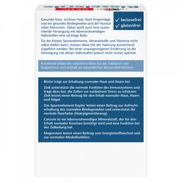 Gesunde Haut, schönes Haar, feste Fingernägel und ein gesundes Bindegewebe sind der Wunsch vieler Menschen. Dabei spielt auch eine ausreichende Versorgung mit lebensnotwendigen Nährstoffen eine wichtige Rolle. Da der Körper Spurenelemente, Mineralstoffe und Vitamine nicht selbst bilden kann, müssen diese mit der Nahrung ausreichend zugeführt werden. Bei einer unausgewogenen Ernährung ist die Versorgung mit diesen Nährstoffen jedoch nicht immer optimal. Kieselerde bildet die natürliche Basis für die Tabletten von Doppelherz und enthält als wesentlichen Bestandteil Silicium. Biotin trägt zur Erhaltung normaler Haut und Haare bei. Zink unterstützt die normale Funktion des Immunsystems und trägt dazu bei, die Zellen vor oxidativem Stress zu schützen. Das wichtige Spurenelement leistet wie Biotin einen Beitrag für den Erhalt normaler Haut und Haare. Es trägt zusätzlich zum Erhalt normaler Nägel bei. Das Spurenelement Kupfer leistet einen Beitrag zur Aufrechterhaltung des normalen Bindegewebes und unterstützt die normale Haarfarbe (Haarpigmentierung). Calcium ist ein lebensnotwendiger Mineralstoff, der für den Erhalt normaler Knochen benötigt wird und eine Funktion bei der Zellteilung hat. Magnesium leistet einen Beitrag zum Energiestoffwechsel und zur normalen Muskelfunktion.