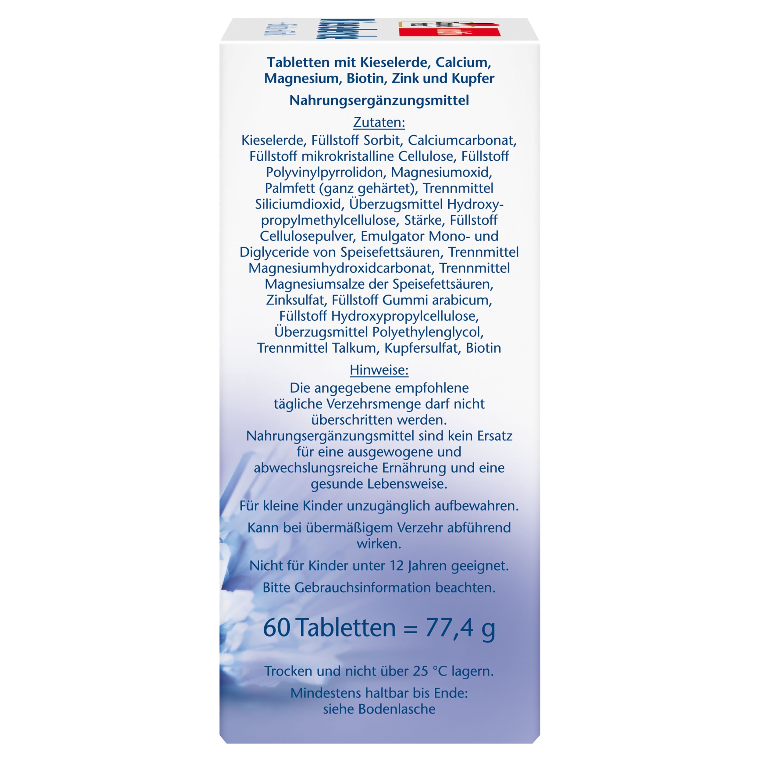 Kieselerde, Füllstoffe Sorbit, Calciumcarbonat, Füllstoff mikrokristalline Cellulose, Füllstoff Polyvinylpyrrolidon, Magnesiumoxid, Palmfett (ganz gehärtet), Trennmittel Siliciumdioxid, Überzugsmittel Hydroxypropylmethylcellulose, Stärke, Füllstoff Cellulosepulver, Emulgator Mono- und Diglyceride von Speisefettsäuren, Trennmittel Magnesiumhydroxidcarbonat, Trennmittel Magnesiumsalze der Speisefettsäuren, Zinksulfat, Füllstoff Gummi arabicum, Füllstoff Hydroxypropylcellulose, Überzugsmittel Polythylenglycol, Trennmittel Talkum, Kupfersulfat, D-Biotin