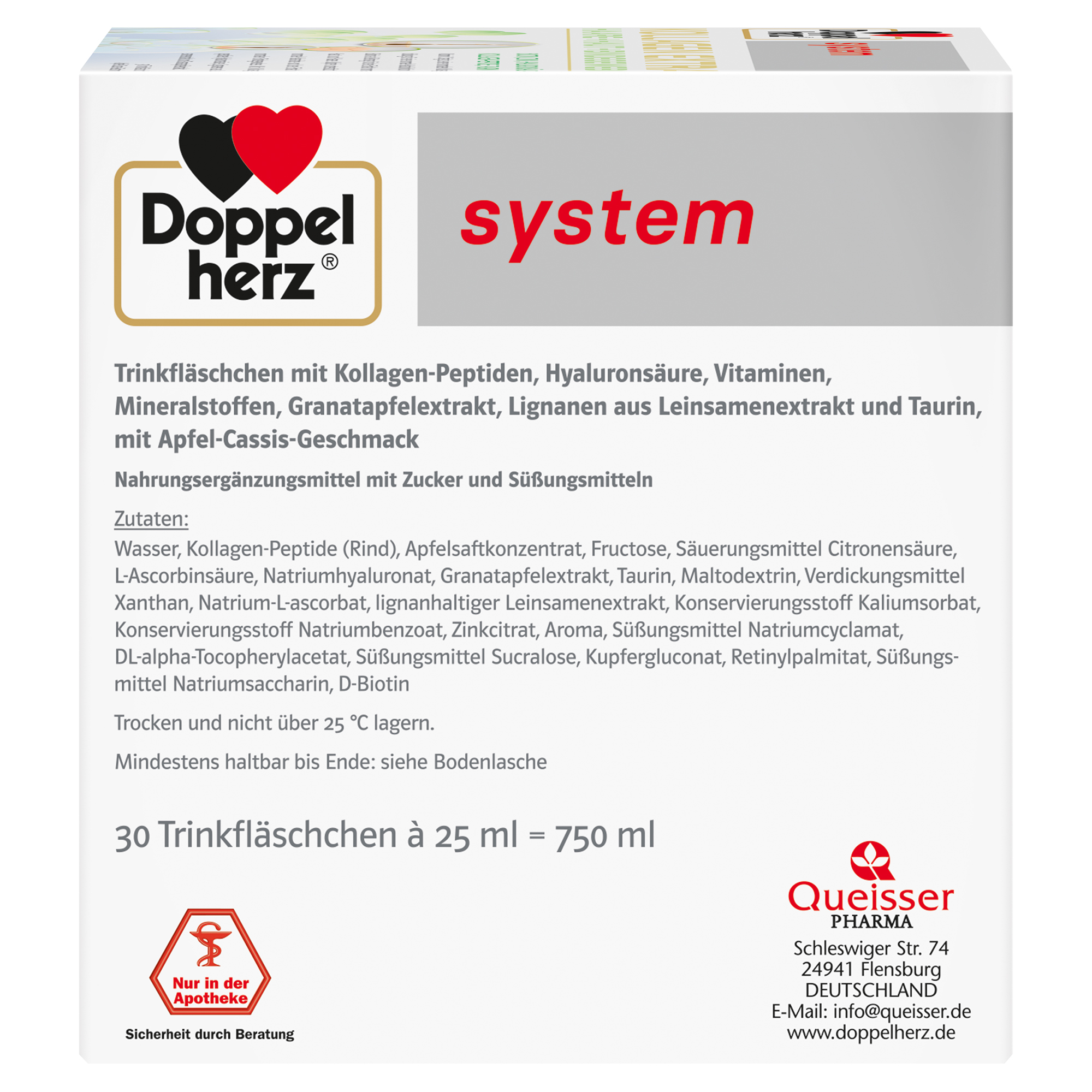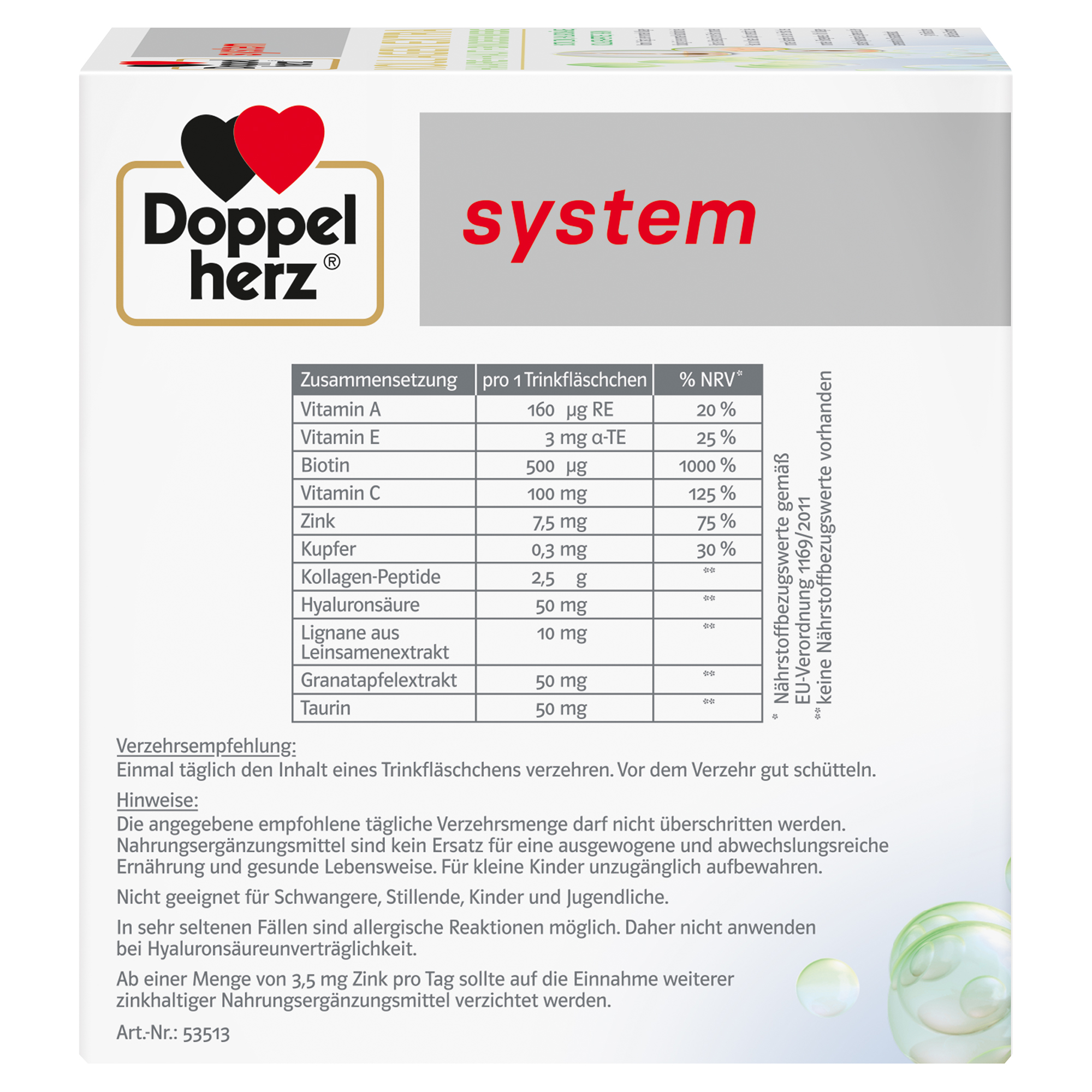 DoppelherzNahrungsergänzungsmittel sind kein Ersatz für eine ausgewogene und abwechslungsreiche Ernährung und eine gesunde Lebensweise. Die angegebene empfohlene tägliche Verzehrsmenge darf nicht überschritten werden. Außerhalb der Reichweite von kleinen Kindern aufbewahren.