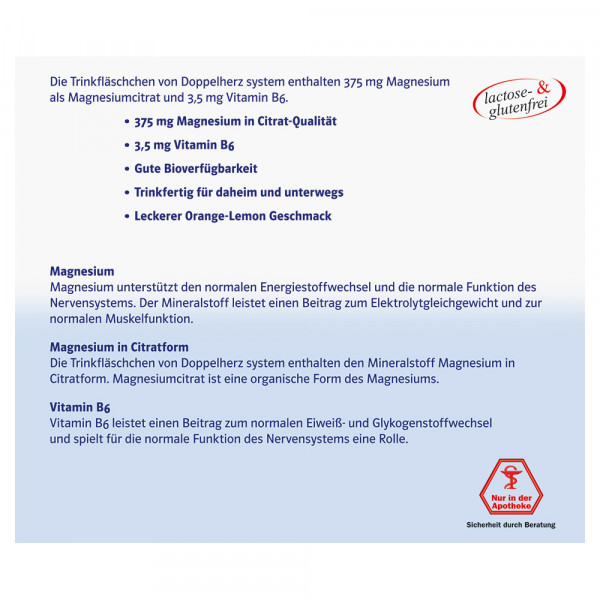 • 375 mg Magnesium in Citrat-Qualität sowie 3,5 mg Vitamin B6 pro Trinkfläschchen