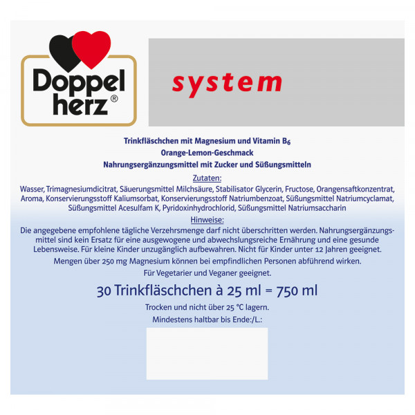 DoppelherzNahrungsergänzungsmittel sind kein Ersatz für eine ausgewogene und abwechslungsreiche Ernährung und eine gesunde Lebensweise. Die angegebene empfohlene tägliche Verzehrsmenge darf nicht überschritten werden. Außerhalb der Reichweite von kleinen Kindern aufbewahren.