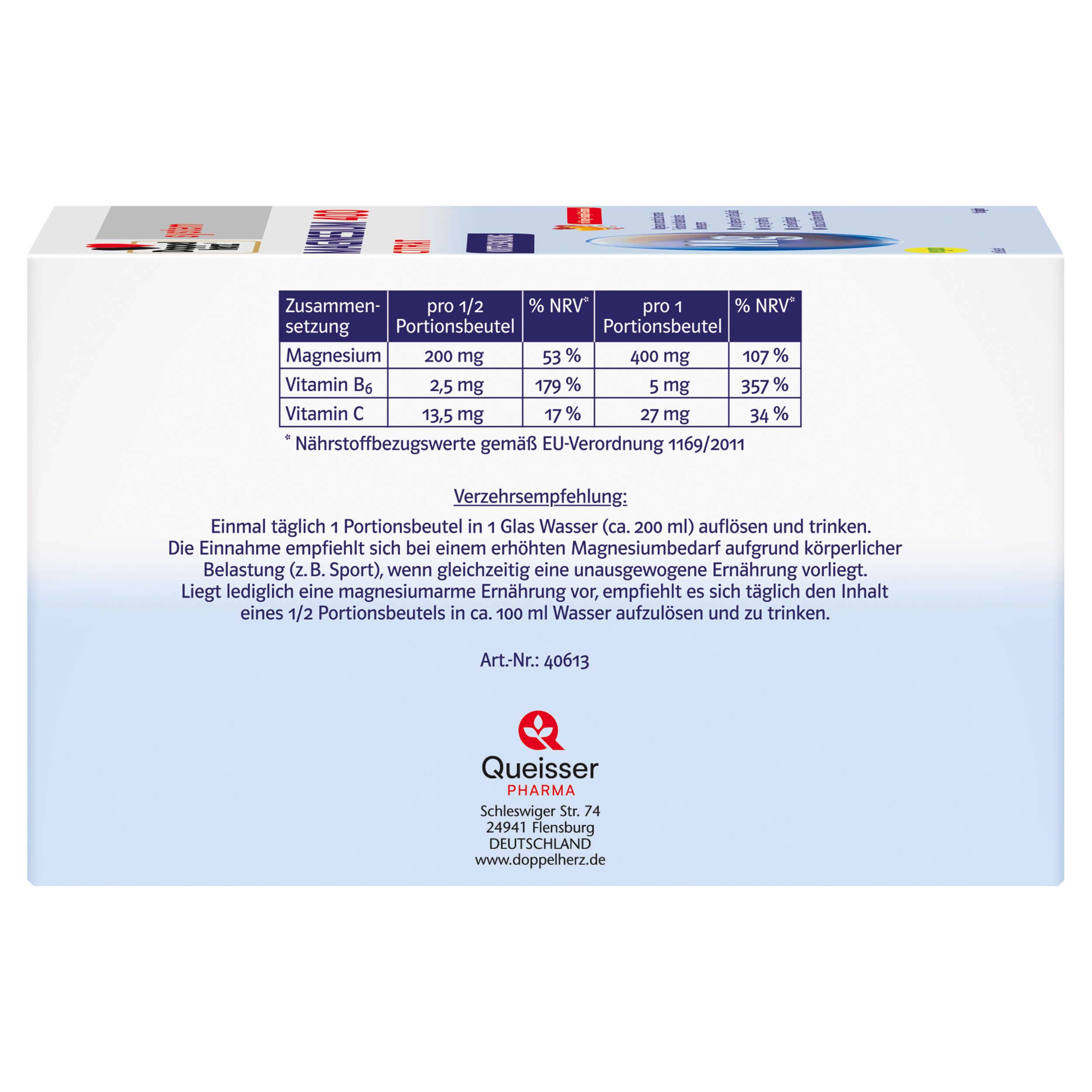 DoppelherzNahrungsergänzungsmittel sind kein Ersatz für eine ausgewogene und abwechslungsreiche Ernährung und eine gesunde Lebensweise. Die angegebene empfohlene tägliche Verzehrsmenge darf nicht überschritten werden. Außerhalb der Reichweite von kleinen Kindern aufbewahren.