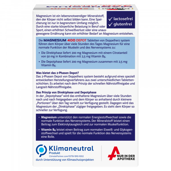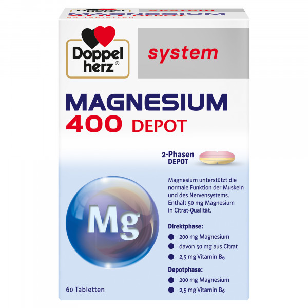 Die MAGNESIUM 400 DEPOT Tabletten von Doppelherz system führen dem Körper über viele Stunden des Tages Magnesium für eine normale Funktion der Muskeln und des Nervensystems zu: Die Direktphase liefert 200 mg Magnesium mit einem Citratanteil von 50 mg in Kombination mit 2,5 mg Vitamin B6. Die Depotphase liefert 200 mg Magnesium zusammen mit 2,5 mg Vitamin B6. Das 2-Phasen Depot von Doppelherz system besteht aufgrund eines speziell entwickelten Herstellungsverfahrens aus zwei unterschiedlichen Tablettenschichten. Es arbeitet nach dem Prinzip der schnellen Nährstofffreigabe und Langzeit-Nährstofffreigabe. In der „Depotphase“ wird das enthaltene Magnesium über viele Stunden nach und nach freigegeben und dem Körper so anhaltend durch kleinere „Portionen“ über den Tag verteilt zur Verfügung gestellt. Dagegen wird das Magnesium der „Direktphase“ zügiger freigegeben. Es steht dem Körper so schneller zur Verfügung. Magnesium unterstützt den normalen Energiestoffwechsel sowie die normale Funktion des Nervensystems. Der Mineralstoff leistet einen Beitrag zum Elektrolytausgleich und zur normalen Muskelfunktion. Vitamin B6 leistet einen Beitrag zum normalen Eiweiß- und Glykogenstoffwechsel und spielt für die normale Funktion des Nervensystems eine Rolle.