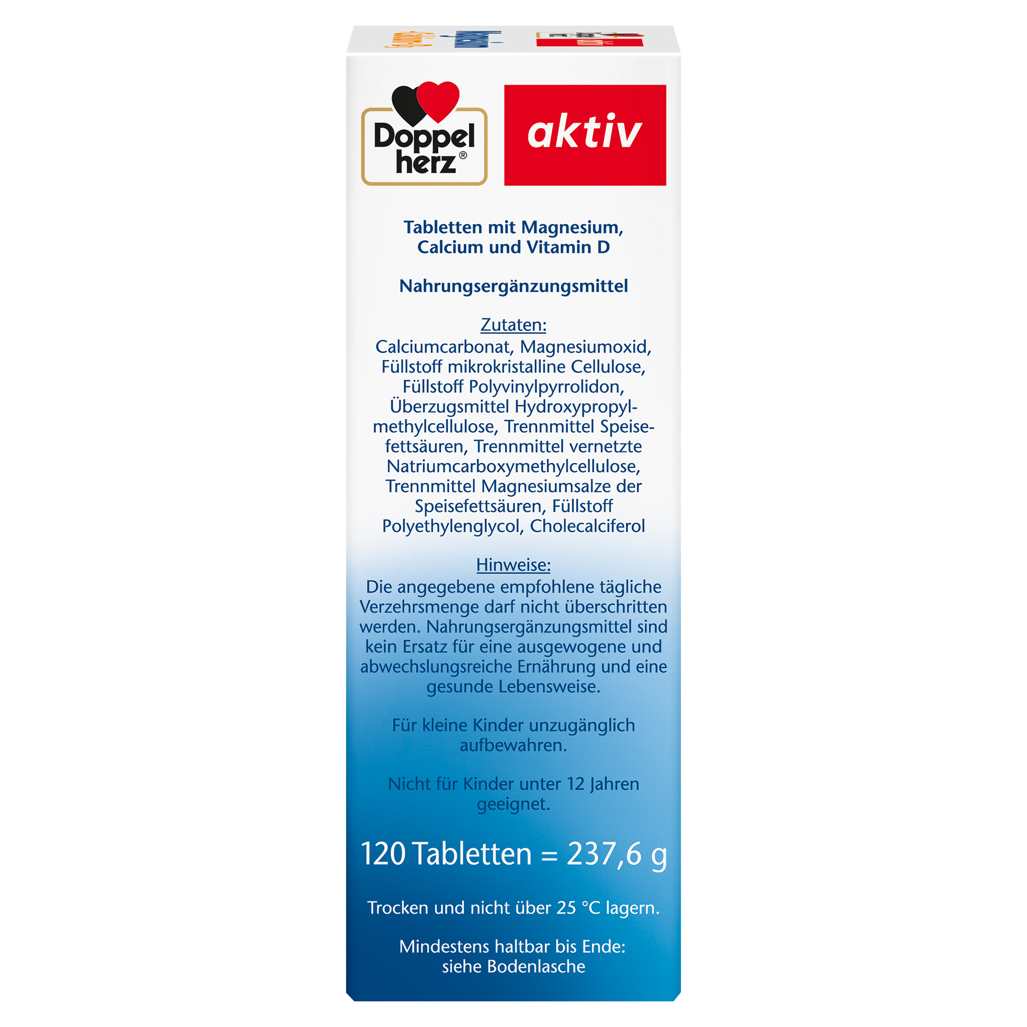 Calciumcarbonat, Magnesiumoxid, Füllstoff mikrokristalline Cellulose, Füllstoff Polyvinylpyrrolidon, Überzugsmittel Hydroxypropylmethylcellulose, Trennmittel Speisefettsäuren, Trennmittel vernetzte Natriumcarboxymethylcellulose, Trennmittel Magnesiumsalze der Speisefettsäuren, Füllstoff Polyethylenglycol, Cholecalciferol