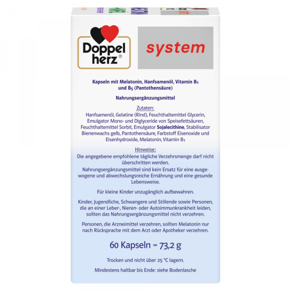 Ausreichender Schlaf ist wichtig für das Wohlbefinden. Der Schlaf besteht aus mehreren Schlafzyklen. Während des Schlafs laufen wichtige Prozesse im Körper ab. Ruhe und Entspannungsphasen wechseln sich mit Tiefschlafphasen ab. Erlebtes wird verarbeitet und Erlerntes wird gespeichert. In den östlichen Kulturen wird Hanföl aufgrund seiner vielfältigen Eigenschaften schon seit Jahrhunderten geschätzt. Hanf ist eine der ältesten Kulturpflanzen der Erde, deren Samen, Blätter, Blüten und Fasern in unterschiedlichster Weise Verwendung finden. So wurden zum Beispiel die Hanfsamen bereits vor Jahrhunderten als Nahrungsmittel genutzt. Das Doppelherz system MELATONIN + HANFÖL ist für die Einnahme vor dem Schlafengehen vorgesehen. Es enthält das „Schlafhormon“ Melatonin. Melatonin ist ein natürlicherweise vorkommendes Hormon, das von der Zirbeldrüse im Zwischenhirn gebildet wird. Melatonin trägt dazu bei, die Einschlafzeit zu verkürzen. Damit sich die positive Wirkung einstellt, sollte kurz vor dem Schlafengehen 1 mg Melatonin aufgenommen werden. Pantothensäure (Vitamin B5) trägt zu einer normalen Synthese und zu einem normalen Stoffwechsel von Steroidhormonen, Vitamin D und einigen Neurotransmittern bei. Vitamin B1 leistet einen Beitrag zu einer normalen Funktion des Nervensystems und einem normalen Energiestoffwechsel.