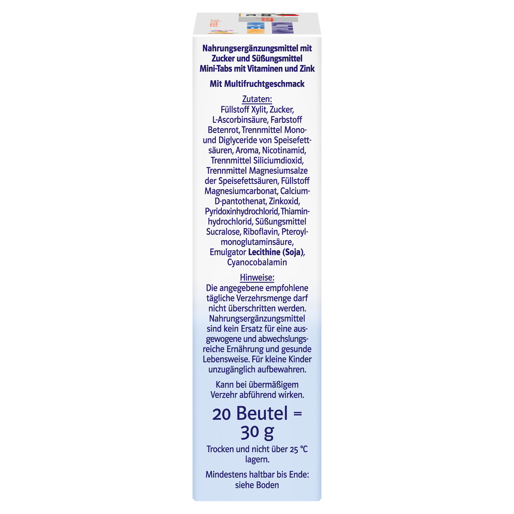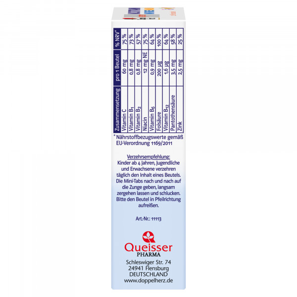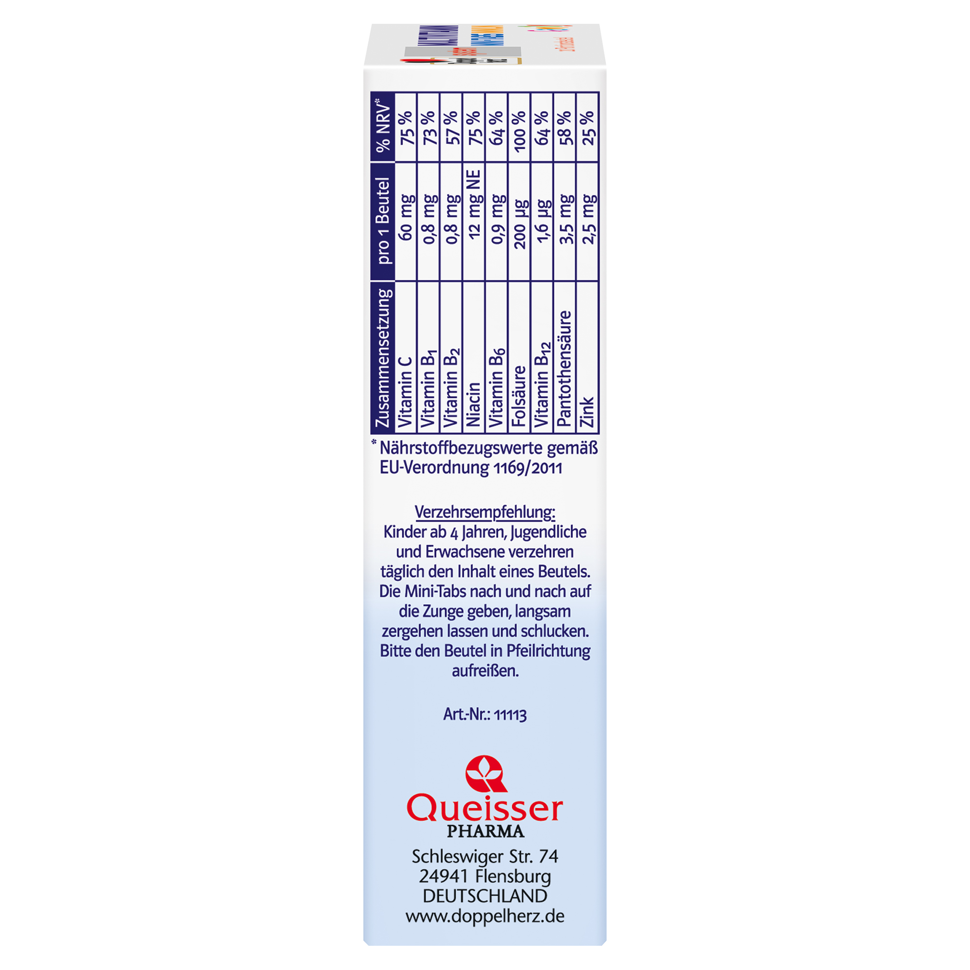 Doppelherz system MULTIVITAMIN Mini-Tabs liefert ausgewählte Vitamine und zusätzlich das Spurenelement Zink. Dank einer neuen Herstellungstechnologie enthält Doppelherz system MULTIVITAMIN Mini-Tabs seine Nährstoffe in Form von innovativen Mini-Tabs mit leckerem Multifruchtgeschmack. Die kleinen Mini-Tabs können jederzeit und an jedem Ort ganz ohne Flüssigkeit eingenommen werden – ideal für unterwegs. Diese Darreichungsform ist für Kinder, Jugendliche und Erwachsene, also für die ganze Familie gut geeignet. Die innovativen Mini-Tabs versorgen den Körper mit wichtigen Nährstoffen, die einen Beitrag leisten: für die normale Funktion des Immunsystems (Vitamin C, Zink), für den Schutz der Zellen vor oxidativem Stress (Vitamin C, Zink), für einen normalen Energiestoffwechsel (Vitamin B1, B2, B6, B12), zur Verringerung von Müdigkeit und Ermüdung (Vitamin B12, Niacin, Folsäure) sowie zur normalen geistigen Leistung (Pantothensäure).
