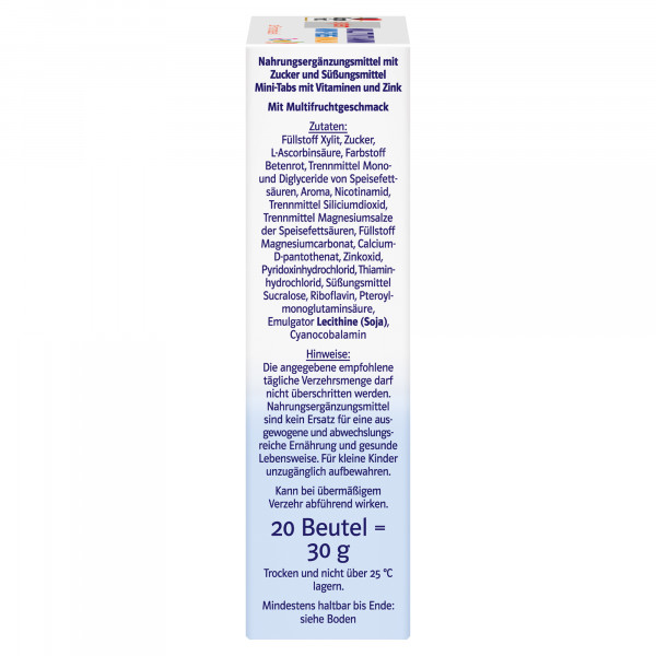 Füllstoff Xylit, Zucker, L-Ascorbinsäure, Farbstoff Betenrot, Trennmittel Mono-und Diglyceride von Speisefettsäuren, Aroma, Nicotinamid, Trennmittel Siliciumdioxid, Trennmittel Magnesiumsalze der Speisefettsäuren, Füllstoff Magnesiumcarbonat, Calcium-D-pantothenat, Zinkoxid, Pyridoxinhydrochlorid, Thiaminhydrochlorid, Süßungsmittel Sucralose, Riboflavin, Pteroylmonoglutaminsäure, Emulgator Lecithine (Soja), Cyanocobalamin
