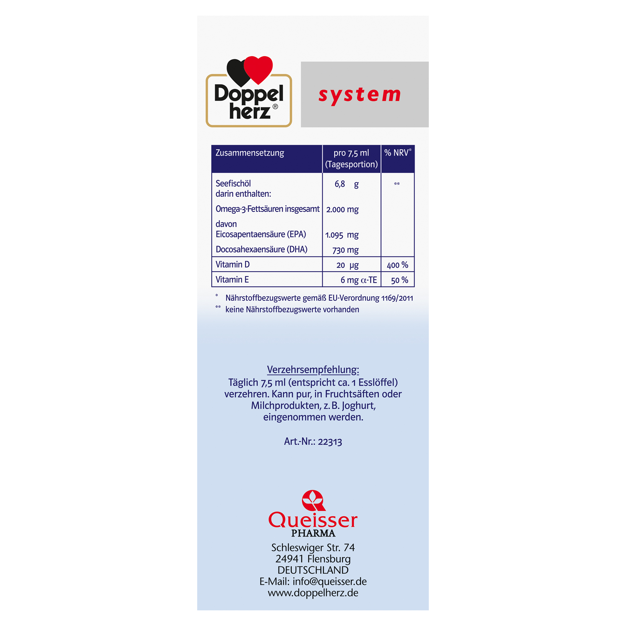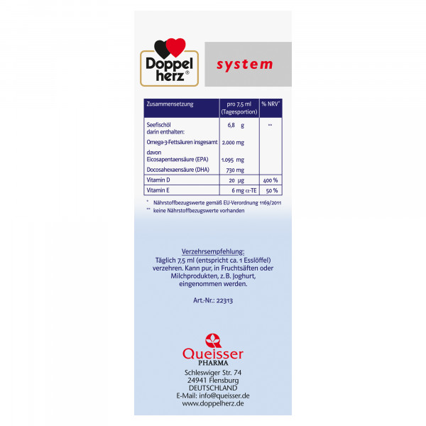 DoppelherzNahrungsergänzungsmittel sind kein Ersatz für eine ausgewogene und abwechslungsreiche Ernährung und eine gesunde Lebensweise. Die angegebene empfohlene tägliche Verzehrsmenge darf nicht überschritten werden. Außerhalb der Reichweite von kleinen Kindern aufbewahren.