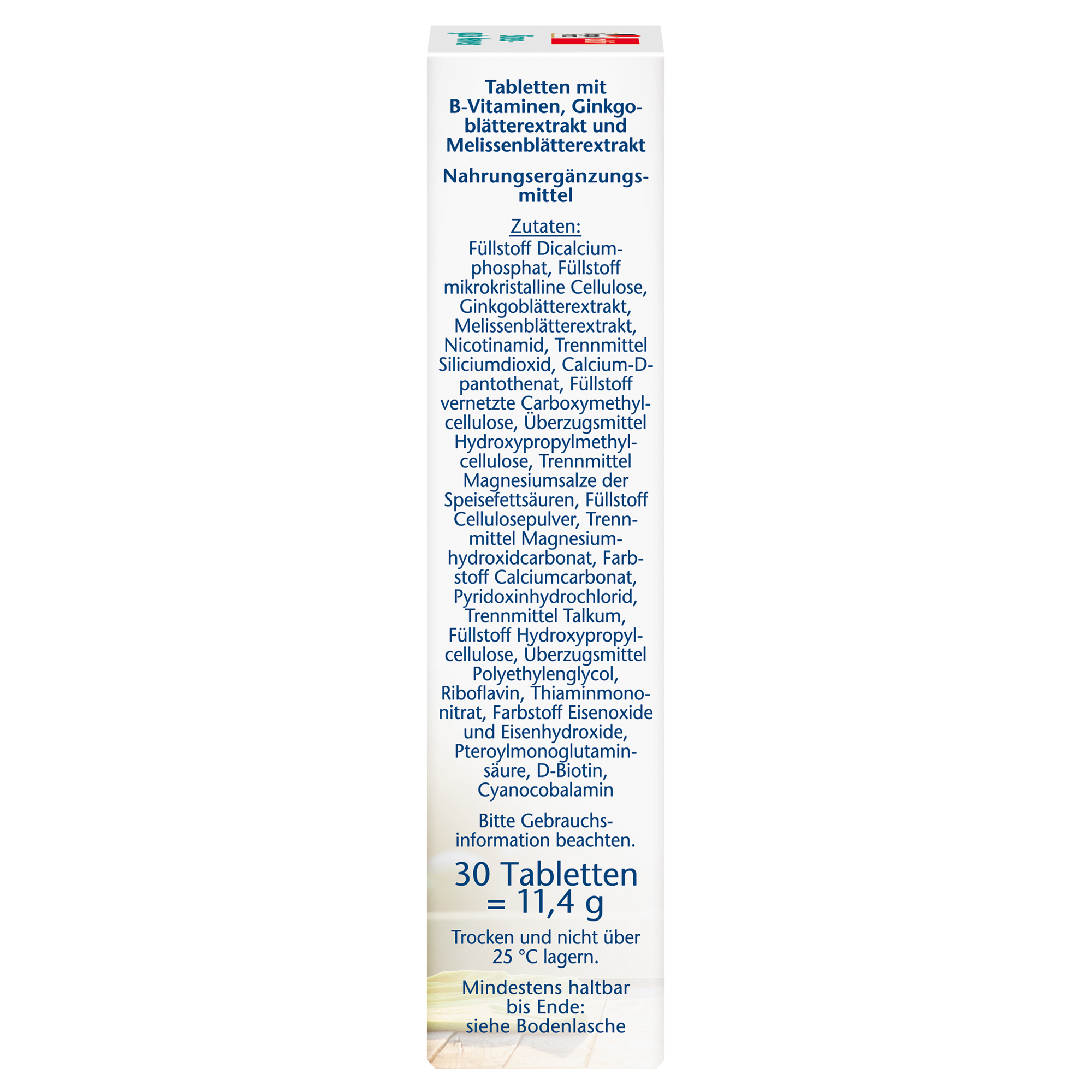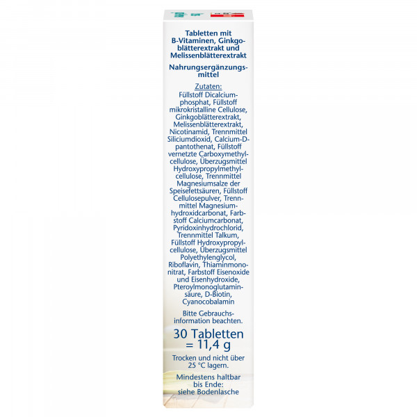Füllstoff Dicalciumphosphat, Füllstoff mikrokristalline Cellulose, Ginkgoblätterextrakt, Melissenblätterextrakt, Nicotinamid, Trennmittel Siliciumdioxid, Calcium-D-pantothenat, Füllstoff vernetzte Carboxymethylcellulose, Überzugsmittel: Hydroxypropyhlmethylcellulose, Trennmittel Magnesiumsalze der Speisefettsäuren, Füllstoff Cellulosepulver, Trennmittel Magnesiumhydroxidcarbonat, Farbstoff Calciumcarbonat, Pyridoxinhydrochlorid, Trennmittel Talkum, Füllstoff Hydroxypropylcellulose, Überzugsmittel Polyethylenglycol, Riboflavin, Thiaminmononitrat, Farbstoff Eisenoxide und Eisenhydroxide, Pteroylmonoglutaminsäure, D-Biotin, Cyanocobalamin