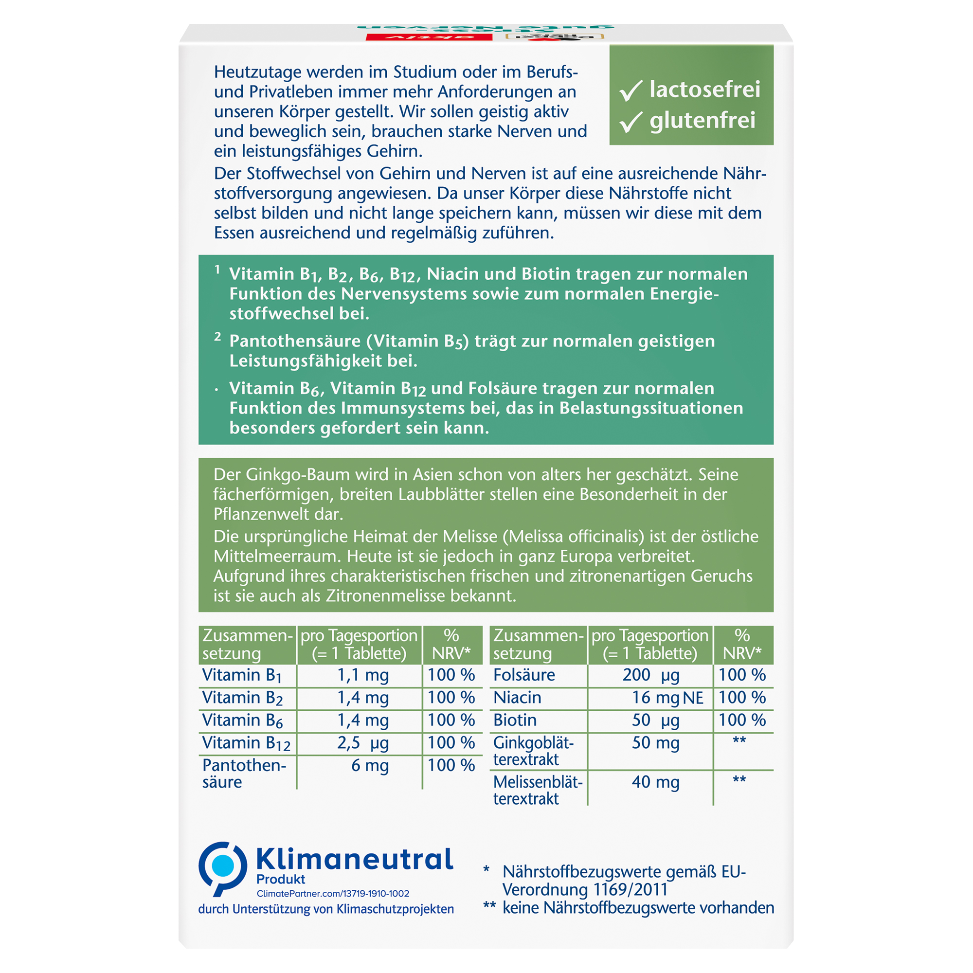 • Plus 50 mg Extrakt aus Ginkgo Biloba und 40 mg Melissenblätterextrakt