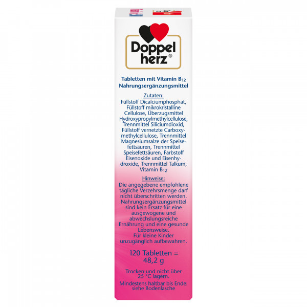DoppelherzNahrungsergänzungsmittel sind kein Ersatz für eine ausgewogene und abwechslungsreiche Ernährung und eine gesunde Lebensweise. Die angegebene empfohlene tägliche Verzehrsmenge darf nicht überschritten werden. Außerhalb der Reichweite von kleinen Kindern aufbewahren.