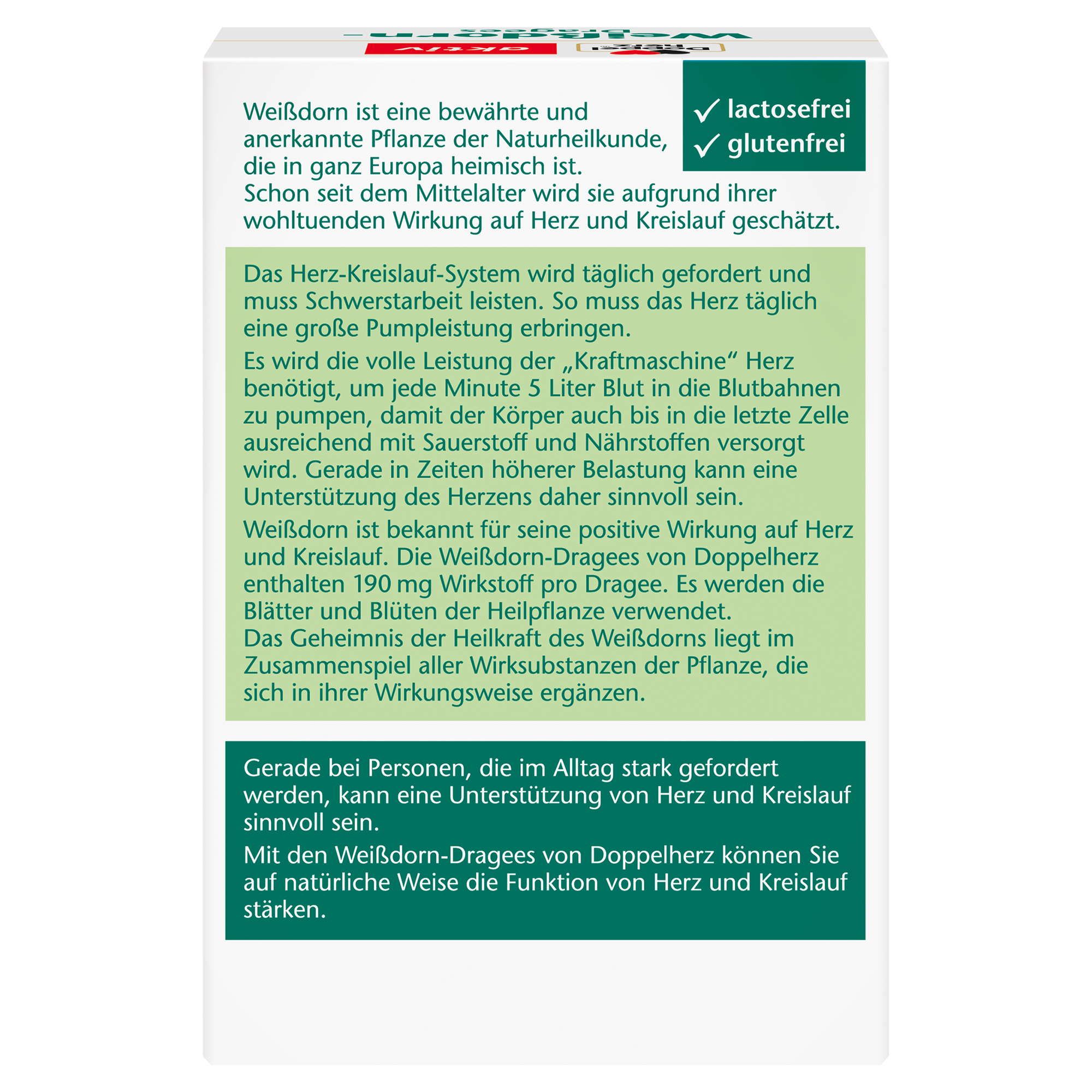 Die Weißdorn-Dragees von Doppelherz sind ein traditionelles pflanzliches Arzneimittel angewendet zur Unterstützung der Herz-Kreislauf-Funktion ausschließlich aufgrund langjähriger Anwendung. Das Herz-Kreislauf-System wird täglich gefordert und muss Schwerstarbeit leisten. So muss das Herz täglich eine große Pumpleistung erbringen. Weißdorn ist bekannt für seine positive Wirkung auf Herz und Kreislauf. Die Weißdorn-Dragees enthalten 190 mg Wirkstoff pro Dragee. Es werden die Blätter und Blüten der Heilpflanze verwendet. Gerade bei Personen, die im Alltag stark gefordert werden, kann eine Unterstützung von Herz und Kreislauf sinnvoll sein.