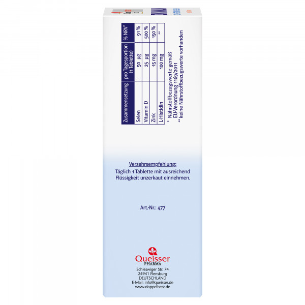 Die ZINK IMMUN DEPOT-Tabletten von Doppelherz system enthalten 15 mg Zink aus organischem Zinkpicolinat in Kombination mit 100 mg Histidin sowie 50 μg Selen und 1000 I.E. Vitamin D3. Zink, Selen und Vitamin D unterstützen eine normale Funktion des Immunsystems. Ein gesundes Immunsystem ist Grundvoraussetzung für unsere Gesundheit. Nicht nur in den nassen und kalten Jahreszeiten, sondern auch in Belastungssituationen (wie z. B. Rauchen, körperliche Anstrengung) können unser Immunsystem und unsere Haut gefordert sein. Dadurch kann auch der Bedarf an Nährstoffen, die hierfür eine Rolle spielen, erhöht sein. Doppelherz system ZINK IMMUN unterstützt bei einem erhöhten Bedarf die tägliche Versorgung. Zink ist aufgrund seiner vielfältigen Funktionen im Körper ein Multitalent für die Gesundheit: es unterstützt den Erhalt normaler Haut, Haare und Nägel, hat eine Funktion bei der Zellteilung, leistet einen Beitrag zu einer normalen kognitiven Funktion und unterstützt zudem den normalen Säure-Basen Stoffwechsel. Bei Zinkpicolinat handelt es sich um eine organische Zinkverbindung. Das enthaltene Zink ist an Picolinsäure gebunden. Da der Körper die Spurenelemente Zink und Selen nicht selbst herstellen kann, sollte auf eine regelmäßige Zufuhr mit der Nahrung geachtet werden. Histidin ist eine essentielle Aminosäure, die regelmäßig und ausreichend über die Nahrung zugeführt werden sollte. Die Tabletten enthalten außerdem 25 μg Vitamin D3 pro Tagesportion (dies entspricht 1000 I.E. Vitamin D3). Die DEPOT-Tablette arbeitet aufgrund eines speziell entwickelten Herstellungsverfahrens wie ein „Nährstoffspeicher“. Aus diesem „Nährstoffspeicher“ werden die Nährstoffe über Stunden nach und nach freigegeben und stehen dem Körper anhaltend zur Verfügung.