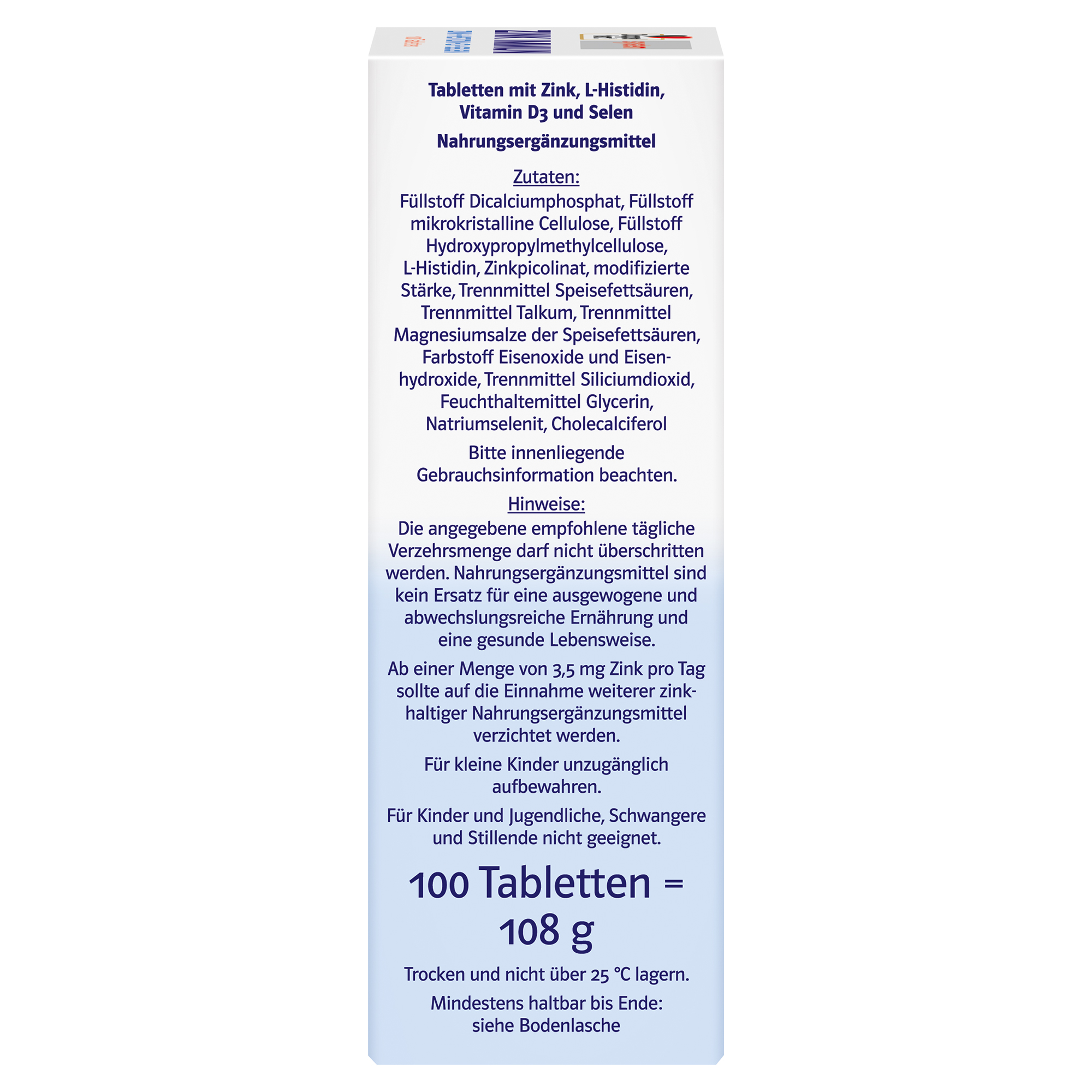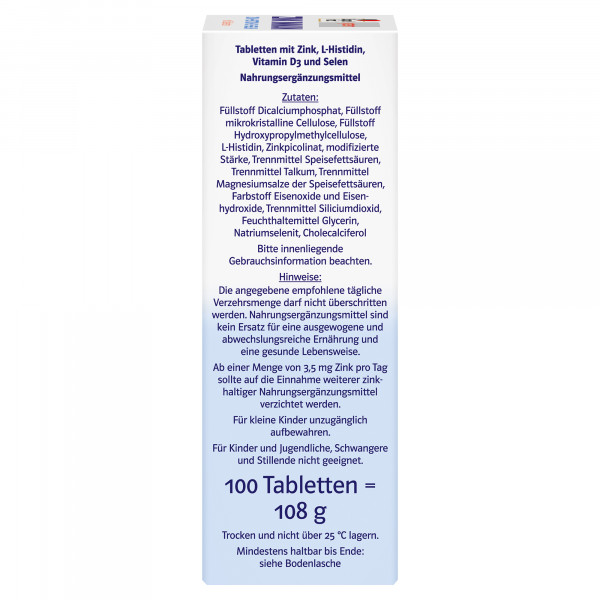 L-Histidin, Zinkpicolinat, modifizierte Stärke, Trennmittel Speisefettsäuren, Trennmittel Talkum, Trennmittel Magnesiumsalze der Speisefettsäuren, Farbstoff Eisenoxide und Eisenhydroxide, Trennmittel Siliciumdioxid,