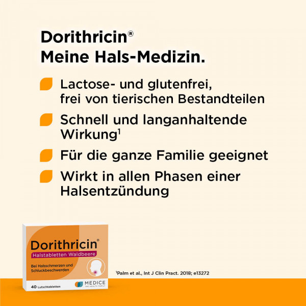 Zur Behandlung von Halsschmerzen und Schluckbeschwerden hat sich Dorithricin® seit Jahrzehnten ausgezeichnet bewährt. Es hilft schnell und effektiv zugleich. Mit der einzigartigen Wirkstoff-Formel lindert Dorithricin® nicht nur schnell den Schmerz, sondern bekämpft auch gezielt Bakterien und Viren (Schmidbauer, M., 2015: Dorithricin® wirkt antiviral (in vitro). Pharm. Ztg., 160. Jahrgang, 38. Ausg.: Seite 48–52) und bremst den Infekt, bevor die Halsschmerzen schlimmer werden.