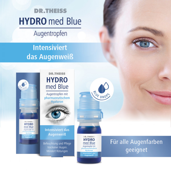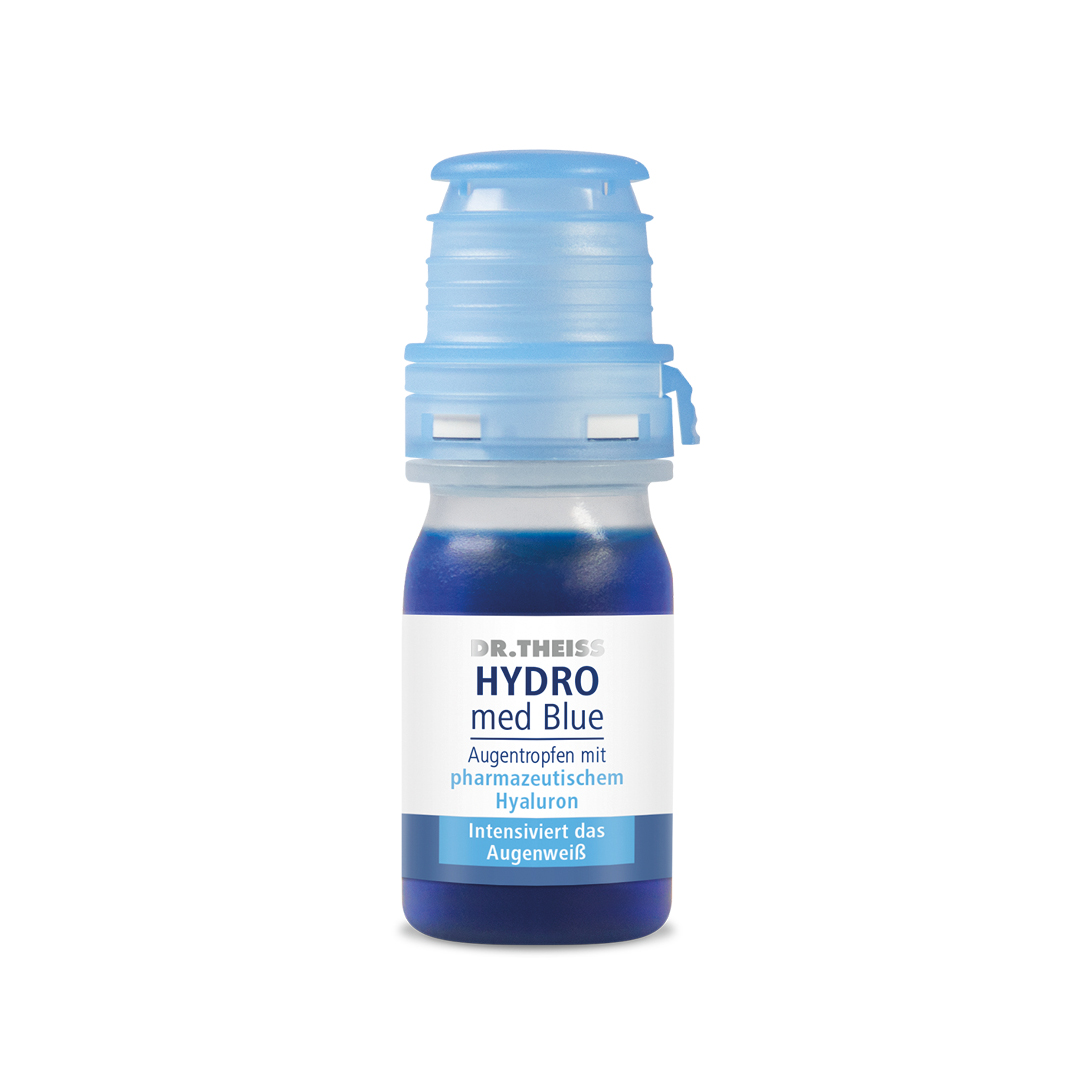 Dr. Theiss HYDRO med Blue Augentropfen werden zur verbesserten Befeuchtung und Pflege trockener Augen und zur sofortigen Linderung der Symptome des Dry Eye Syndroms (brennende, rote, juckende, gereizte und tränende Augen) angewandt. Intensiviert so das Augenweiss.