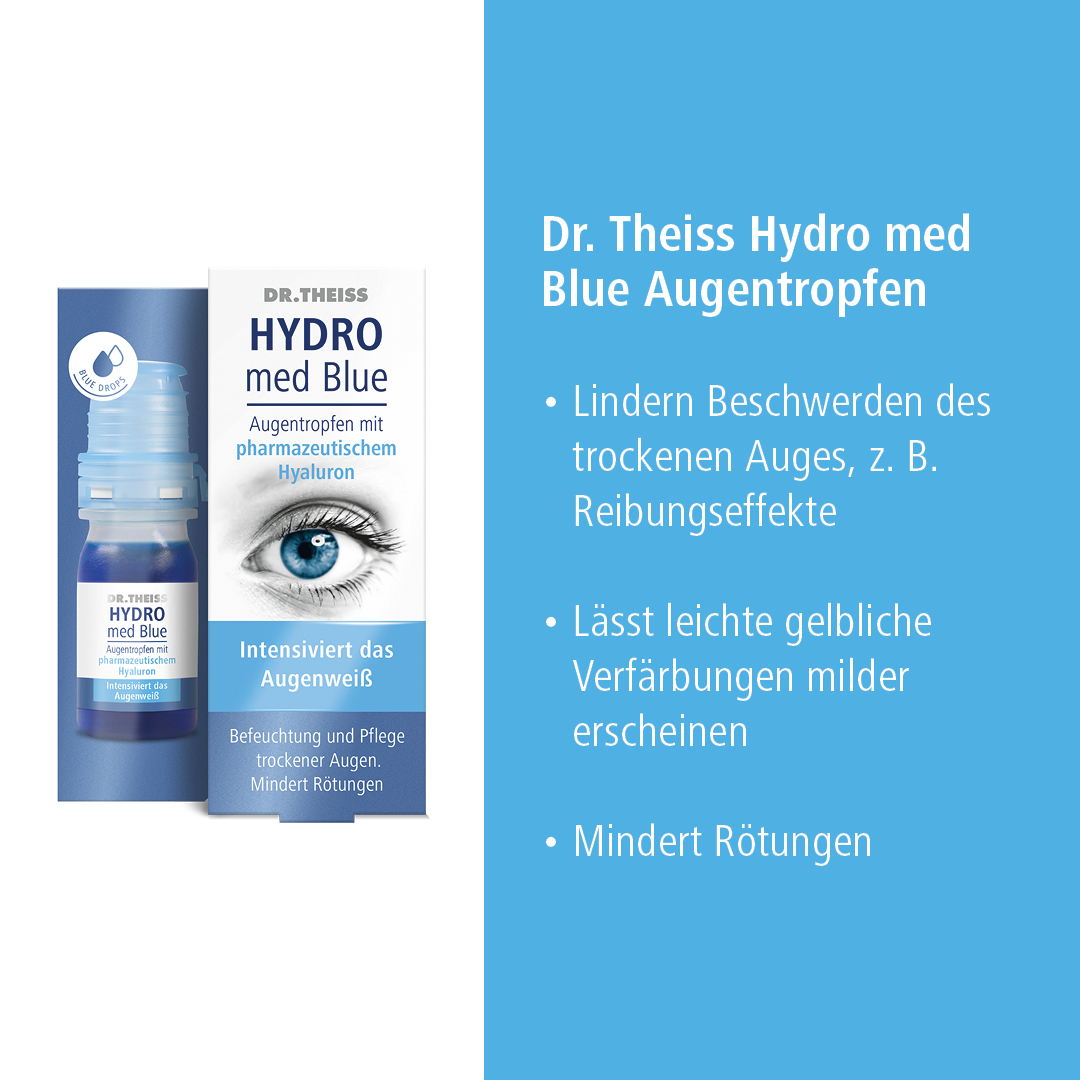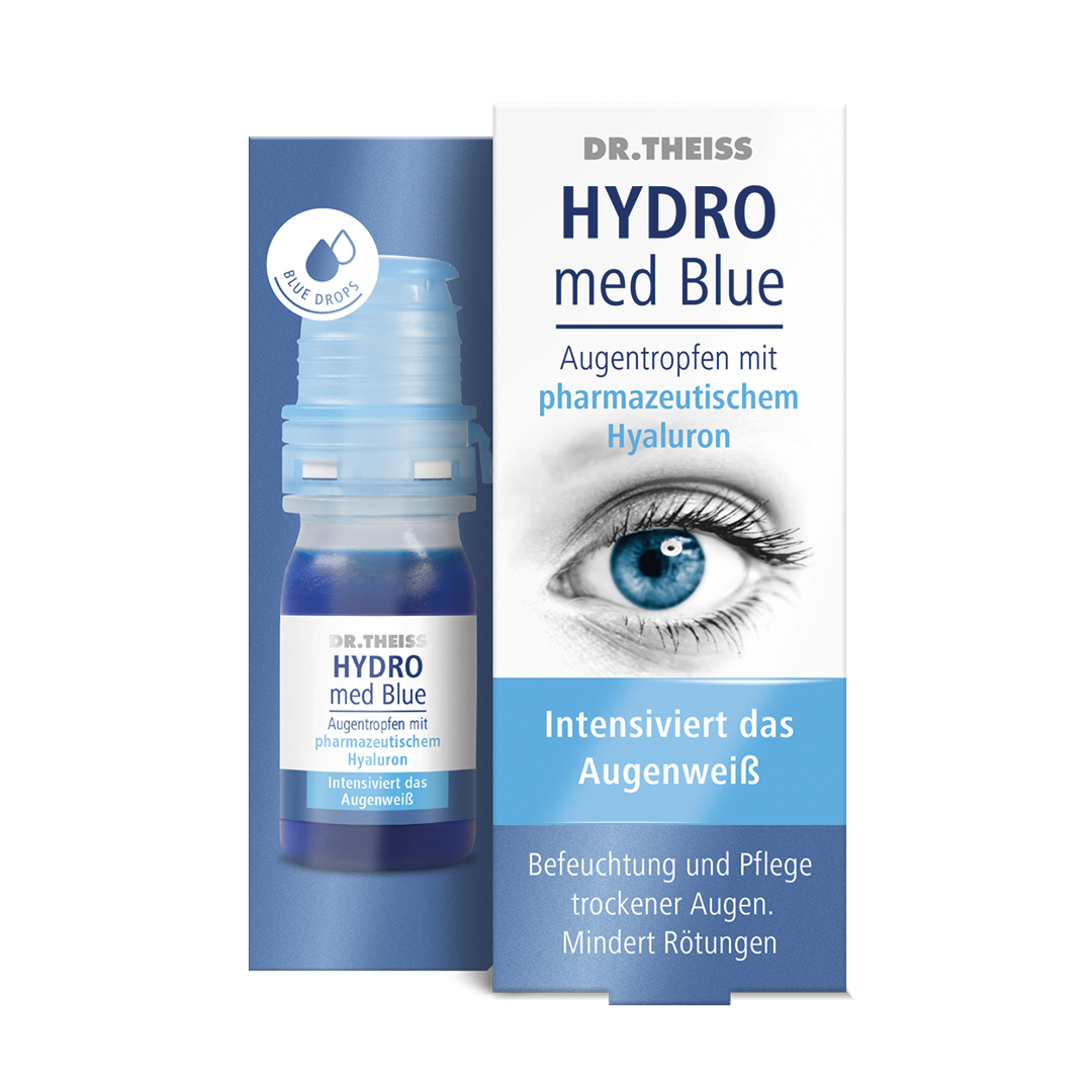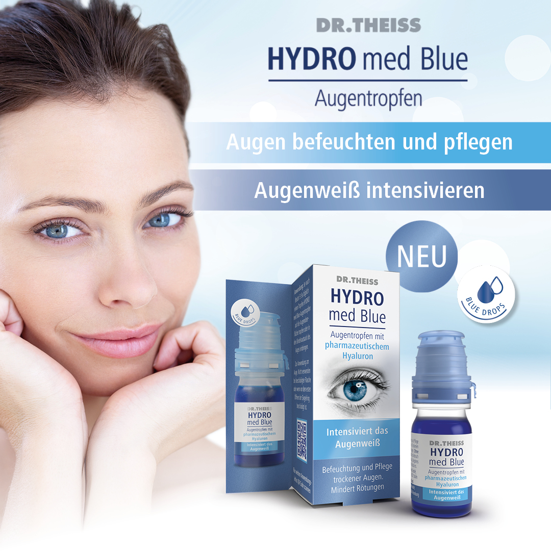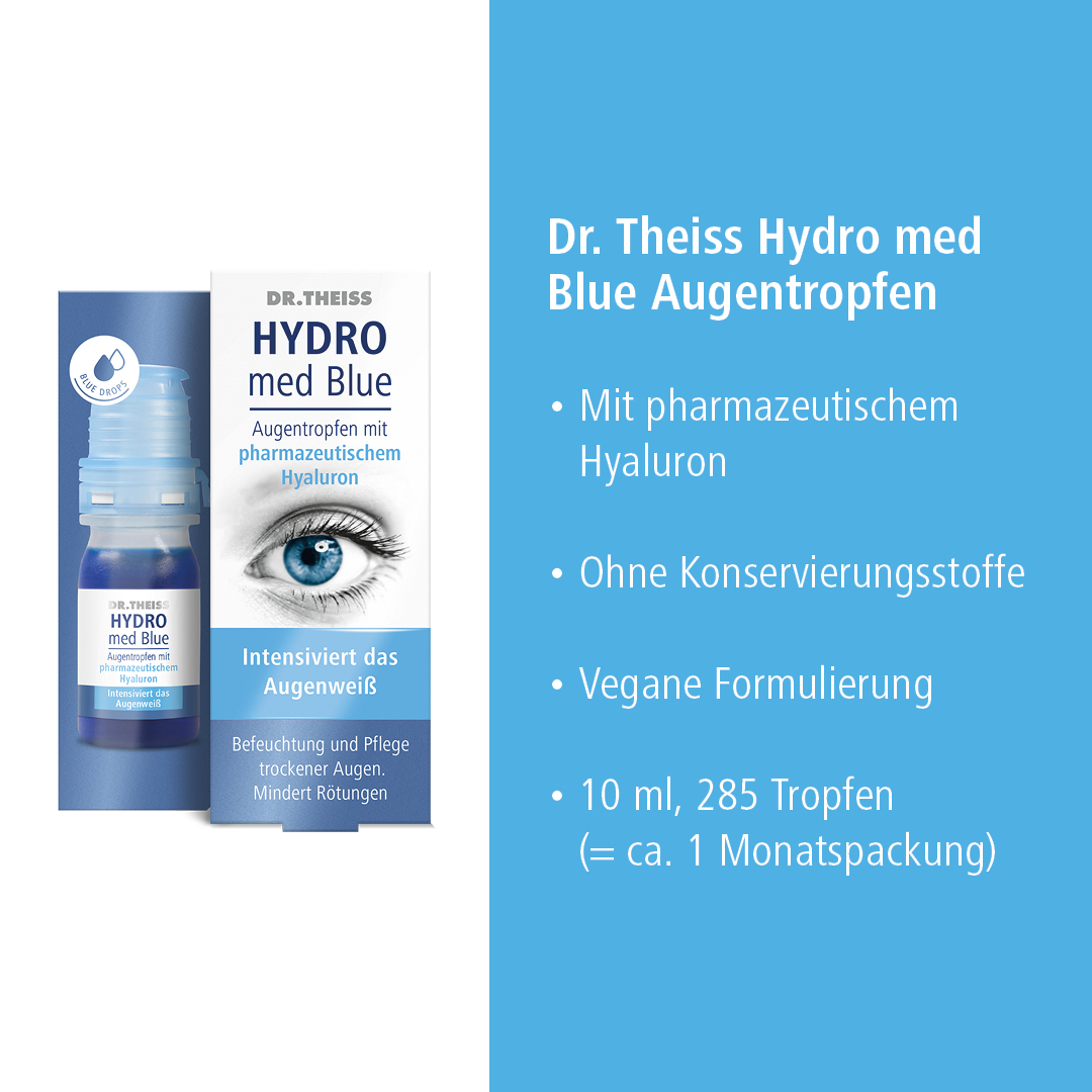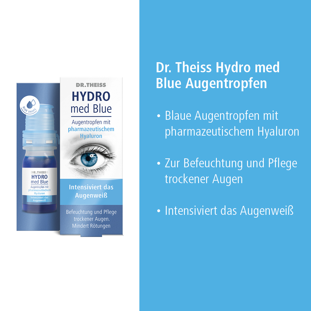 Mit den feuchtigkeitsspendenden Dr. Theiss HYDRO med Blue Augentropfen mit pharmazeutischem Hyaluron kann die Symptomatik verbessert werden. Denn Dr. Theiss HYDRO med Blue Augentropfen enthalten Natriumhyaluronat, das aufgrund der besonderen, physikalischen Eigenschaften einen gleichmäßigen, viskoelastischen Schutzfilm für die Hornhaut bildet, ohne die Sehleistung zu beeinträchtigen.