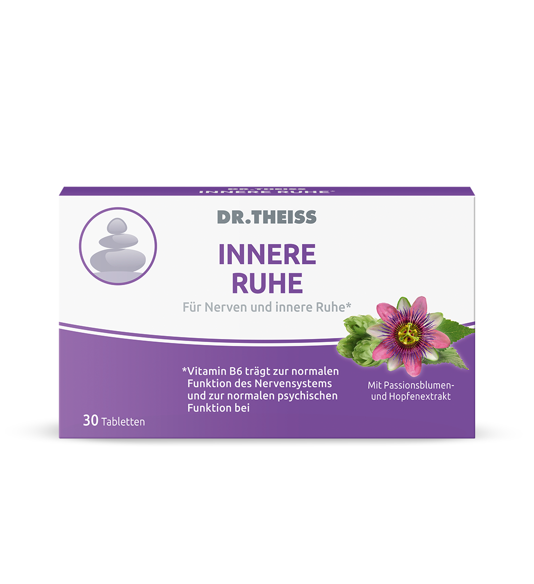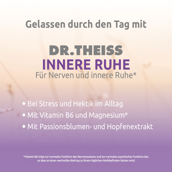 Nahrungsergänzungsmittel mit Vitamin B6, Magnesium plus Passionsblumen- und Hopfenextrakt. Verspüren Sie eine innere Unruhe? Können Sie nicht zur Ruhe kommen? Stress und Hektik im Alltag führt oft zu Überlastung im Berufs- und Privatleben. Dr. Theiss Innere Ruhe* enthält Pflanzenextrakte (Passionsblume und Hopfen), Magnesium und Vitamin B6. Vitamin B6 trägt zur normalen Funktion des Nervensystems und zur normalen psychischen Funktion bei, so dass es einen wertvollen Beitrag zu Ihrem täglichen Wohlbefinden leisten wird.