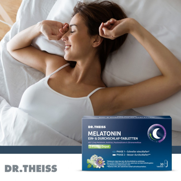 Vertrauen Sie bei Schlafproblemen auf DR. THEISS – Die meistverkauften Melatonin-Produkte in der deutschen Apotheke*. DR. THEISS Melatonin Ein- & Durchschlaf-Tabletten sind ein Nahrungsergänzungsmittel mit Melatonin und Extrakten aus Baldrianwurzel, Passionsblume und Zitronenmelisse. Melatonin ist ein natürlich vorkommendes Hormon, das von der Zirbeldrüse in unserem Gehirn produziert wird. Es spielt eine wichtige Rolle bei der Regulation unseres Schlaf-Wach-Zyklus. Melatonin wird oft als Einschlafhilfe verwendet, um Menschen dabei zu helfen, besser einzuschlafen und durchzuschlafen. Stressige Lebensphasen, Schicht- und Nachtarbeit oder lange Flugreisen über mehrere Zeitzonen hinweg, können zu Schlafproblemen führen. Für viele Menschen, die unter Schlafstörungen leiden, kann Melatonin eine effektive Lösung sein. Schlafstörungen können verschiedene Formen annehmen, wie zum Beispiel Schwierigkeiten beim Einschlafen, häufiges Aufwachen während der Nacht oder das Gefühl von nicht erholsamem Schlaf. In solchen Fällen kann die Einnahme von Melatonin z. B. in Form von Ein- & Durchschlaf-Tabletten helfen, den Schlaf-Wach-Rhythmus zu regulieren und die Schlafqualität zu verbessern. Erholsamer Schlaf ist wichtig, um die körperliche und geistige Gesundheit sowie Leistungsfähigkeit zu erhalten. Während des Schlafs erholt sich unser Körper von den Aktivitäten des Tages und bereitet sich auf den nächsten Tag vor. Stressige Lebensphasen, Schicht- und Nachtarbeit können zu Einschlafproblemen führen. DR. THEISS Melatonin Ein- & Durchschlaf-Tabletten mit einem innovativen 2-Phasen-Freisetzungsprozess: 1. Phase (schneller einschlafen): 1 mg Melatonin* trägt dazu bei die Einschlafzeit zu verkürzen. Passionsblume und Zitronenmelisse können den Schlaf unterstützen und für Entspannung sorgen. 2. Phase (besser durchschlafen**): 0,5 mg Melatonin und Baldrianwurzel-Extrakt** werden zeitversetzt abgegeben. Baldrian unterstützt das Durchschlafen. • Nahrungsergänzungsmittel bei Schlafproblemen • Schneller einschlafen, besser durchschlafen • Schlaftabletten (Nahrungsergänzungsmittel) mit 2-Phasen-Freisetzungsprozess • Unterstützung des natürlichen Schlafzyklus • Mit Melatonin, Passionsblumen- und Baldrianextrakt und Zitronenmelisse. • Laktosefrei, zuckerarm und alkoholfrei • Vegan *Melatonin trägt dazu bei, die Einschlafzeit zu verkürzen. Die positive Wirkung stellt sich ein, wenn kurz vor dem Schlafengehen 1 mg Melatonin aufgenommen wird. **Baldrian hilft, den natürlichen Schlaf aufrechtzuerhalten.