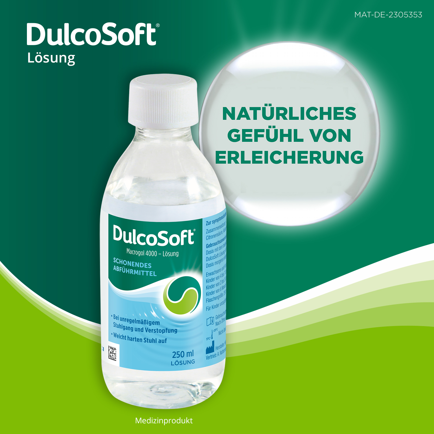 DulcoSoft® Lösung sorgt für schonende Erleichterung bei Verstopfung, ohne plötzlichen Drang. Der Inhaltsstoff Macrogol 4000 wirkt auf schonende Weise: Er bindet Wassermoleküle im Darm, der Stuhl wird aufgeweicht, das Stuhlvolumen nimmt zu und die natürliche Darmtätigkeit wird unterstützt. Der Stuhlgang normalisiert sich.
