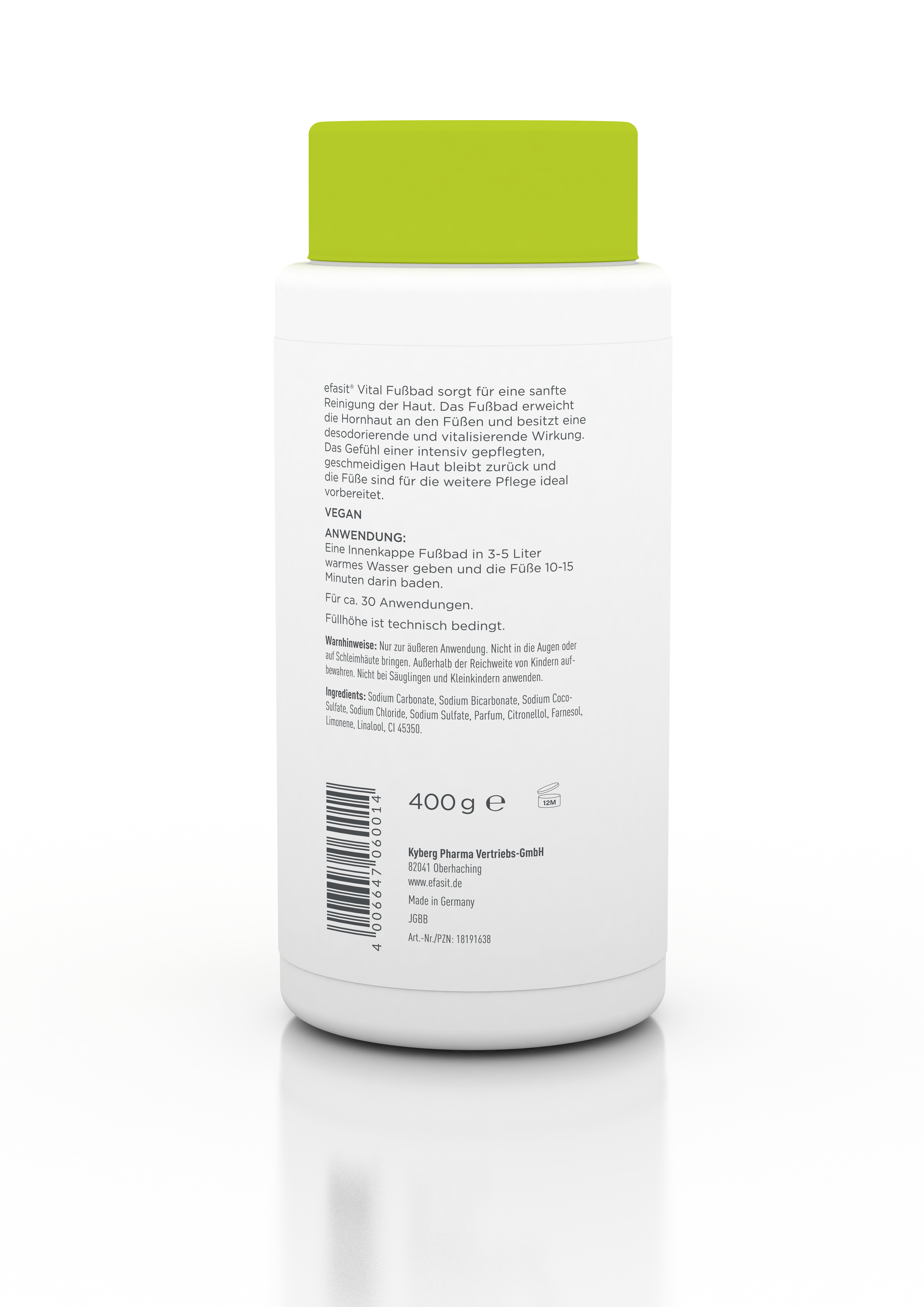 Das efasit Vital Fußbad sorgt für eine sanfte Reinigung der Haut. Es erweicht die Hornhaut an den Füßen und besitzt eine desodorierende und vitalisierende Wirkung. Dadurch kann das Fußbad auch gegen Schweißfüße angewendet werden. Das Fußbad dient als optimale Vorbereitung für die weitere, verwöhnende Fußpflege. Das Gefühl einer intensiv gepflegten, geschmeidigen Haut bleibt zurück. Das efasit Vital Fußbad eignet sich auch als perfekte Erholung für die Füße nach einem anstrengenden Tag.