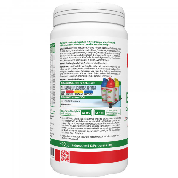 Zwei Esslöffel (ca. 30 g) in 300 ml Wasser oder Magermilch einrühren und mit dem Megamax-Mixbecher ca. 30 Sekunden lang kräftig schütteln. Vorzugsweise zwischen den Mahlzeiten und nach dem Training, oder im Rahmen einer kalorienreduzierten Diät nach Plan trinken.