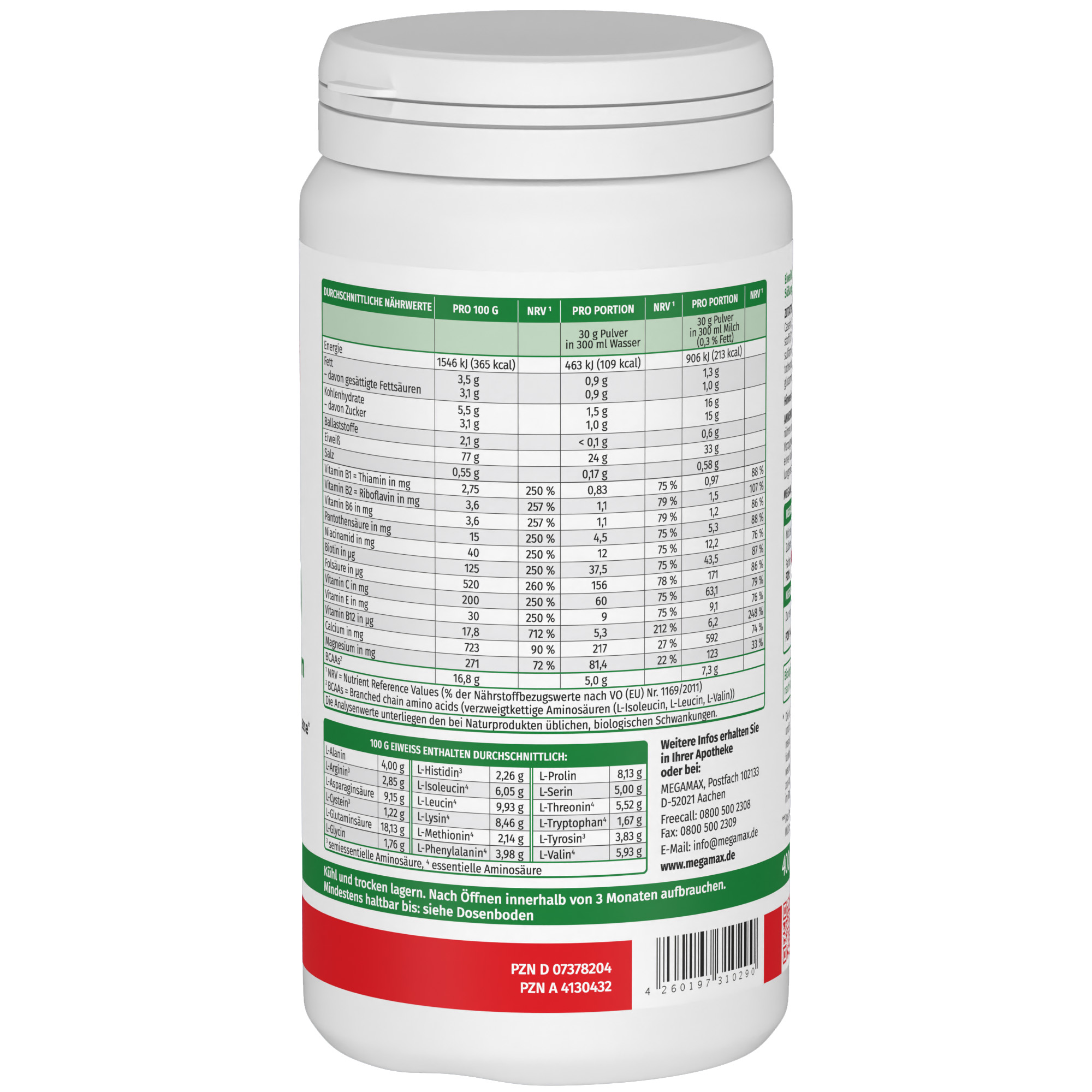 Zwei Esslöffel (ca. 30 g) in 300 ml Wasser oder Magermilch einrühren und mit dem Megamax-Mixbecher ca. 30 Sekunden lang kräftig schütteln. Vorzugsweise zwischen den Mahlzeiten und nach dem Training, oder im Rahmen einer kalorienreduzierten Diät nach Plan trinken.