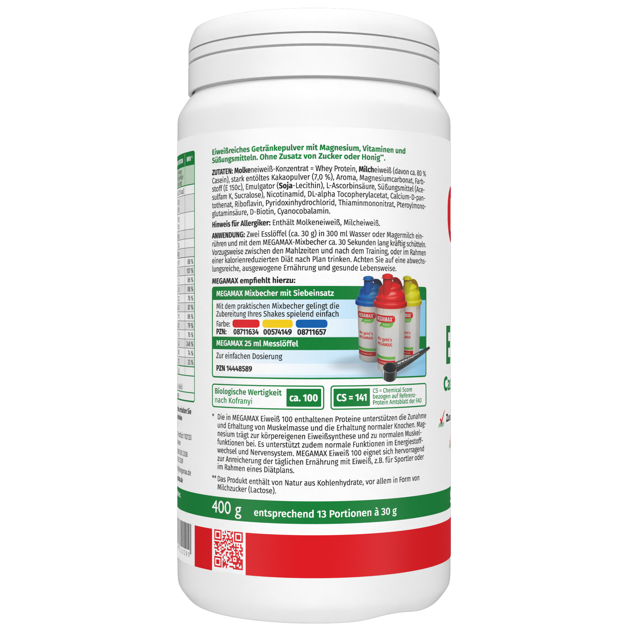 Molkeneiweiß-Konzentrat = Whey Protein, Milcheiweiß (davon ca. 80% Casein), stark entöltes Kakaopulver (7,0%), Aroma, Magnesiumcarbonat, Farbstoff (E 150c), Emulgator (Soja-Lecithin), L-Ascorbinsäure, Süßungsmittel (Acesulfam K, Sucralose), Nicotinamid, DL-alpha Tocopherylacetat, Calcium-D-pantothenat, Riboflavin, Pyridoxinhydrochlorid, Thiaminmononitrat, Pteroylmonoglutaminsäure, D-Biotin, Cyanocobalamin.