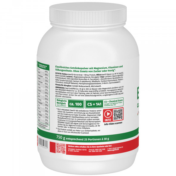 Zwei Esslöffel (ca. 30 g) in 300 ml Wasser oder Magermilch einrühren und mit dem Megamax-Mixbecher ca. 30 Sekunden lang kräftig schütteln. Vorzugsweise zwischen den Mahlzeiten und nach dem Training, oder im Rahmen einer kalorienreduzierten Diät nach Plan trinken.