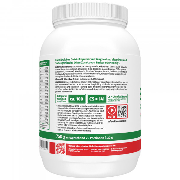 Zwei Esslöffel (ca. 30 g) in 300 ml Wasser oder Magermilch einrühren und mit dem Megamax-Mixbecher ca. 30 Sekunden lang kräftig schütteln. Vorzugsweise zwischen den Mahlzeiten und nach dem Training, oder im Rahmen einer kalorienreduzierten Diät nach Plan trinken.
