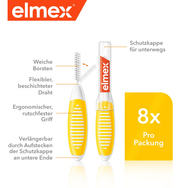 Freuen Sie sich auf eine effektive Plaqueentfernung – und das an den schwer erreichbaren Stellen zwischen den Zähnen, an die Ihre Zahnbürste alleine nicht heranreicht. Übrigens: Dank der praktischen Schutzkappe sind die elmex Interdentalbürsten auch optimal für unterwegs geeignet.