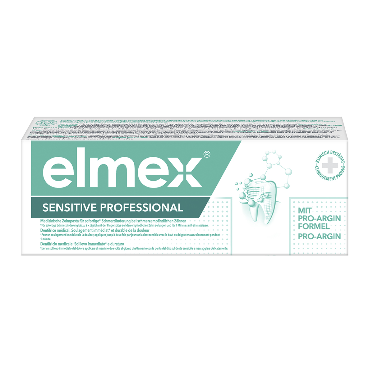 elmex SENSITIVE PROFESSIONAL Zahnpasta enthält die neuartige PRO-ARGIN™ Technologie, die auch in der zahnärztlichen Praxis eingesetzt wird. Die Wirkstoffkombination aus Arginin und Calciumcarbonat verschließt direkt und tief die Reizleiterkanälchen (Dentintubuli), wodurch sofortige* Schmerzlinderung eintritt.