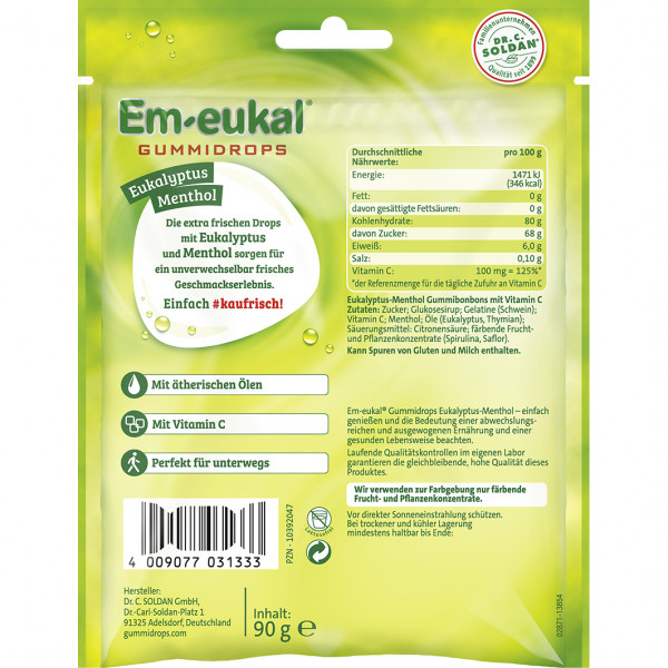 Laktosefrei und glutenfrei. Em-eukal Gummidrops Eukalyptus-Menthol einfach genießen und die Bedeutung einer abwechslungsreichen und ausgewogenen Ernährung und einer gesunden Lebensweise beachten.