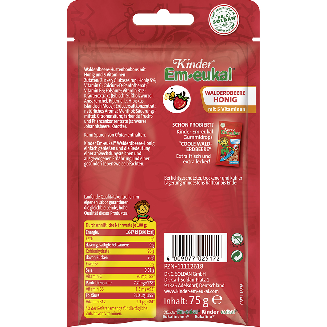 Das beliebte Kinder Em-eukal Hustenbonbon gibt es erstmalig mit neuem Geschmack: Fruchtige Walderdbeere vereint sich mit sanftem Honig zu einem extra milden Genuss. Hergestellt mit hochwertigen, natürlichen Zutaten und fünf sorgfältig ausgewählten Vitaminen. Klein, rund und lecker – für Groß und Klein.