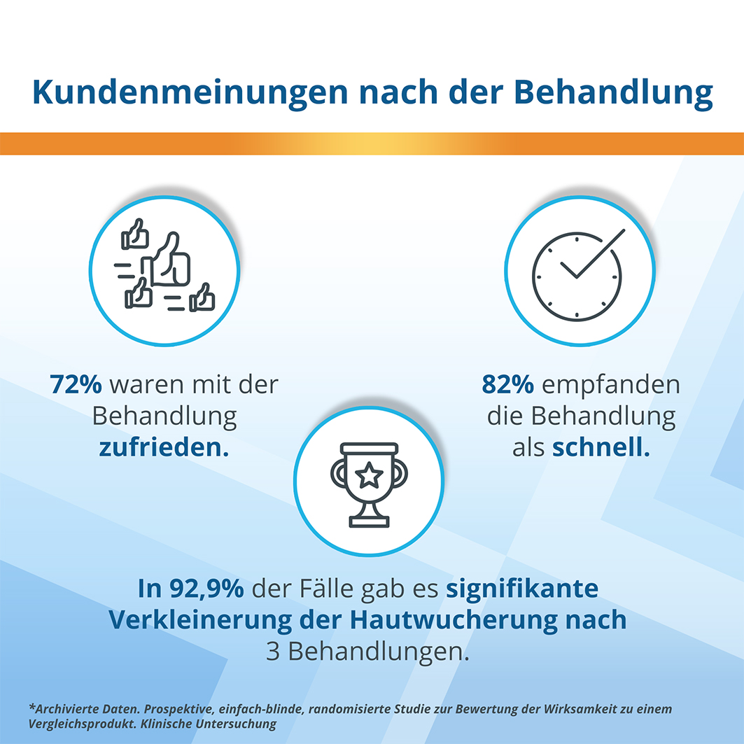 EndWarts Extra gegen Stielwarzen ist sehr wirksam. Wenn die Stielwarze oder ein Teil davon nach 14 Tagen nicht verschwunden ist, wiederholen Sie die Behandlung. Wenn Sie mehrere dicht beieinander liegende Stielwarzen haben (< 3 cm), müssen Sie jede Stielwarze einzeln behandeln. Warten Sie 14 Tage, bevor Sie eine andere Stielwarze behandeln. Das gleichzeitige Vereisen von mehr als einer Stielwarze auf einer sehr kleinen Fläche kann zu Hautschäden führen. Das Innere der Stielwarze wird schnell erreicht und wird durch die kalte Temperatur zerstört. In einigen Fällen können mehrere Behandlungen erforderlich sein.
