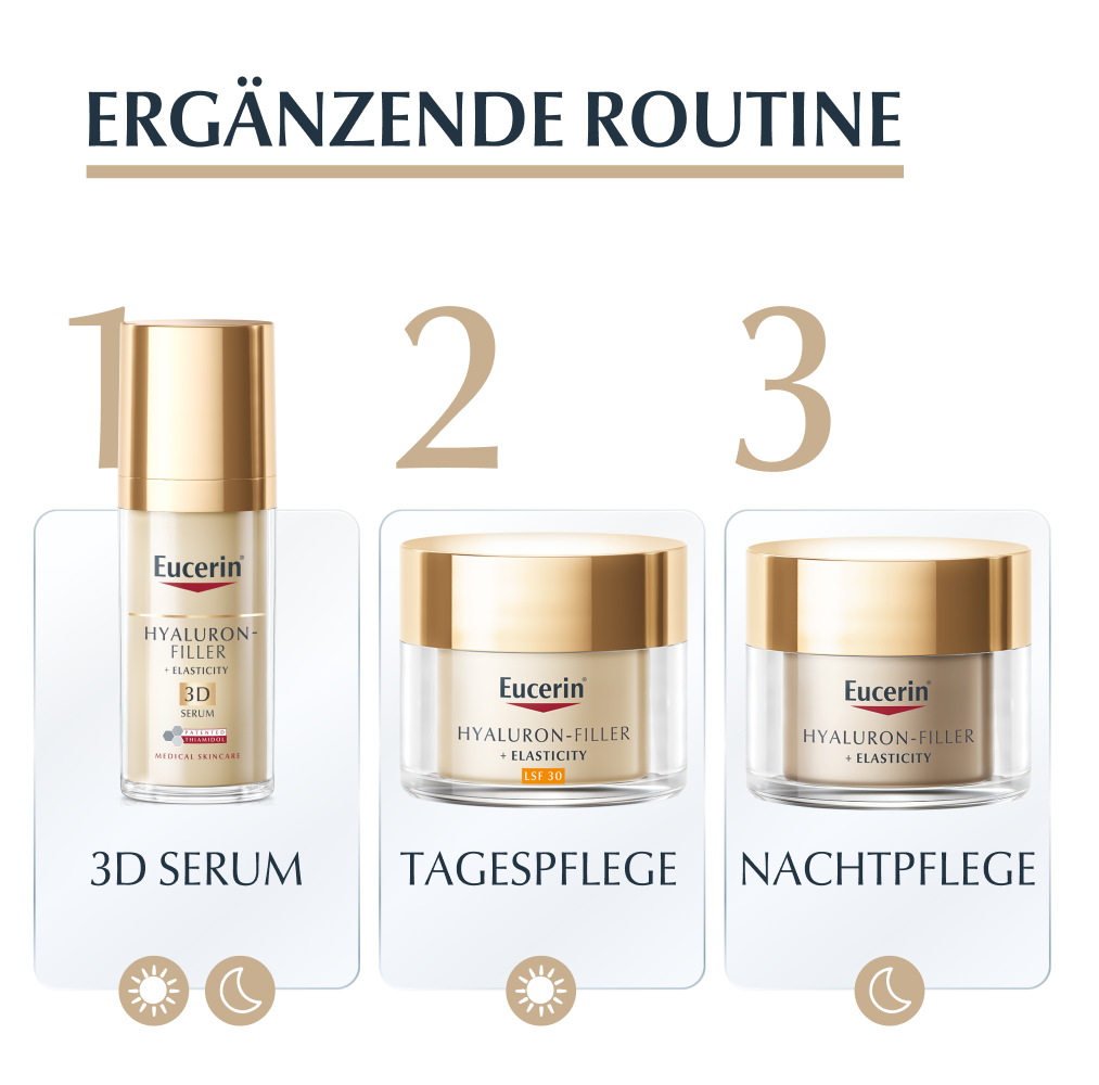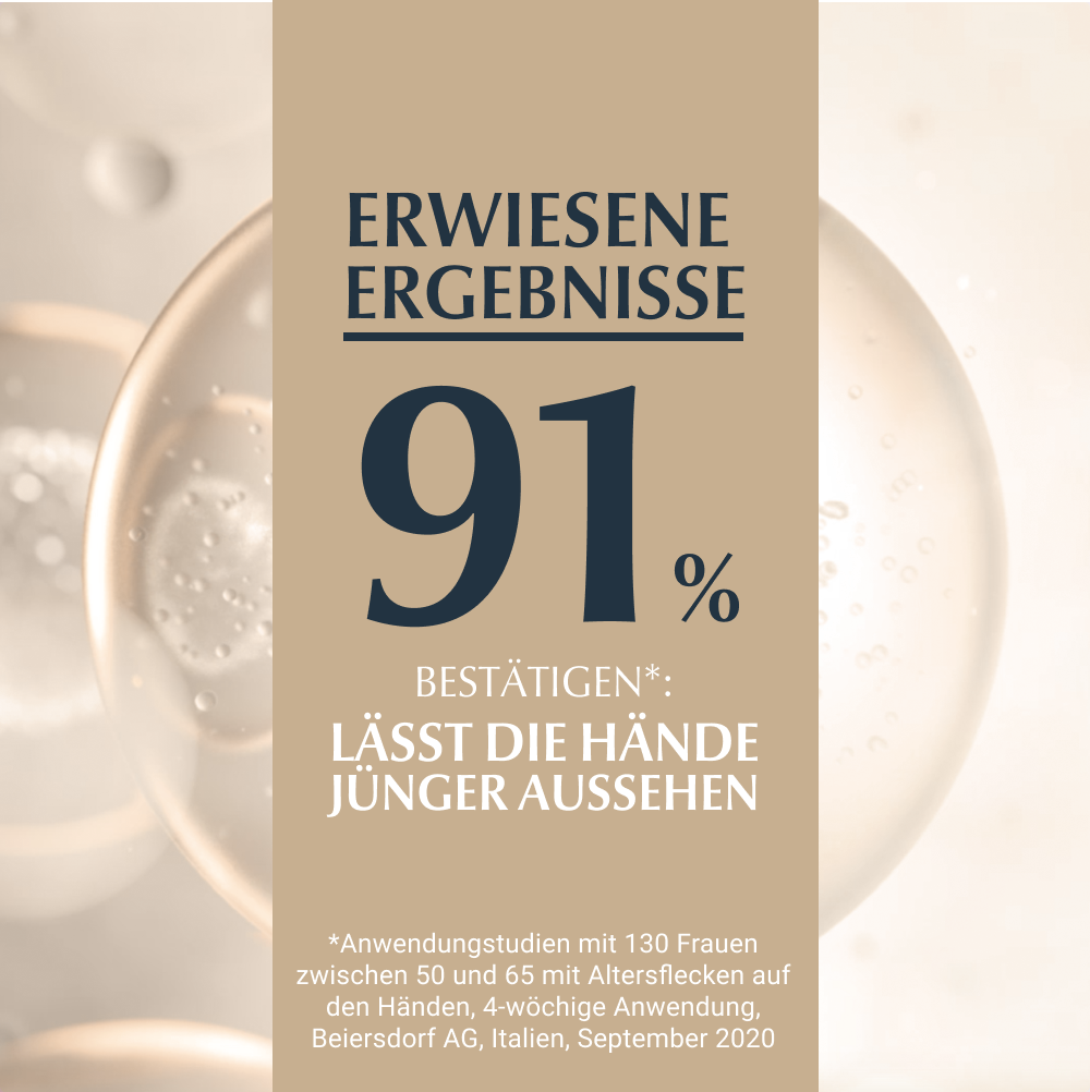 Die Eucerin Hyaluron Filler + Elasticity Handcreme ist eine feuchtigkeitsspendende Handpflege für reife Haut. Dank des patentierten Wirkstoffs Thiamidol kann sie nicht nur Altersflecken mildern, sondern beugt auch der Neuentstehung vor. Altersflecken werden nachweislich bei regelmäßiger Anwendung auf der Hand gemildert. Die Anti Age Hautcreme zieht schnell ein und versorgt die Haut bis zu 24 Stunden mit intensiver Feuchtigkeit – für ein weiches Hautgefühl. Zudem beugt die Handcreme dank LSF 30 der Entstehung neuen, sonnenbedingten Altersflecken vor. Für geschmeidige Hände verbessert die Anti Aging Creme die Elastizität und Festigkeit der Haut. Erste Ergebnisse der Anti Age Creme sowie eine Minderung der Altersflecke sind bereits nach 2 Wochen sichtbar.