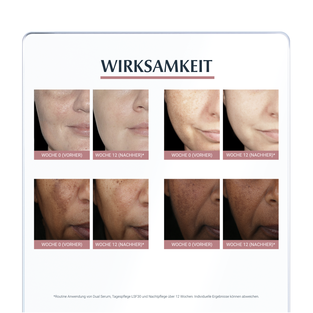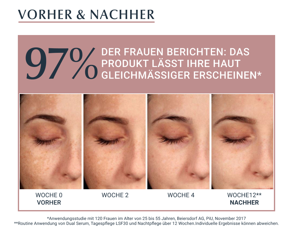 Erste Ergebnisse sind schon nach 2 Wochen sichtbar und verbessern sich bei kontinuierlicher Anwendung stetig weiter. Die sehr gute Hautverträglichkeit und die Wirksamkeit des Serums ist klinisch und dermatologisch erwiesen.