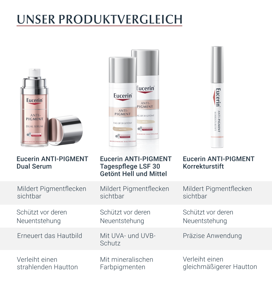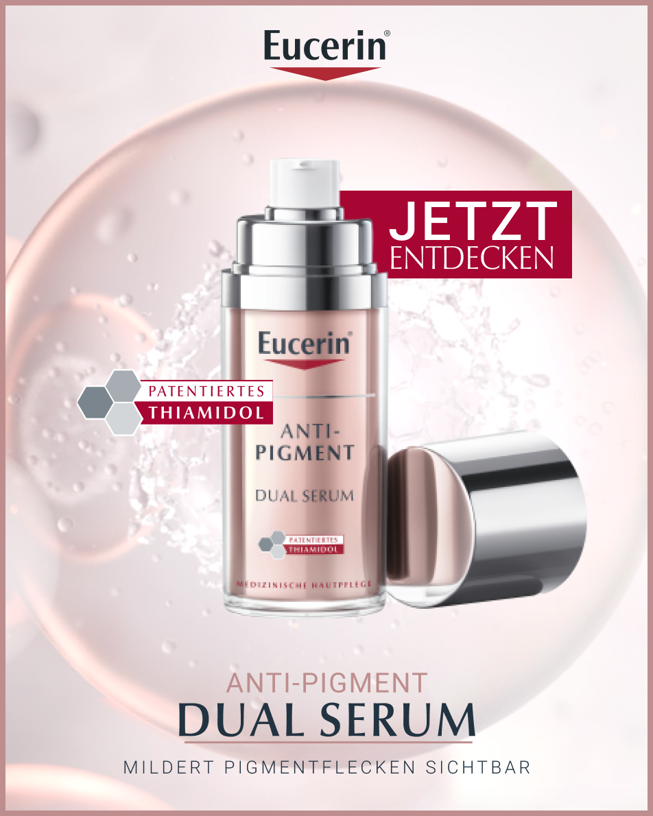 Das Eucerin Anti-Pigment Dual Serum mit dem Einkammer-Spender wirkt mit patentiertem Thiamidol®, das Pigmentflecken und sogenannte Altersflecken am Ursprung bekämpft, diese nach und nach mildert sowie bei regelmäßiger Anwendung verhindert, dass neue Pigmentflecken entstehen. Zusätzlich enthält die Gesichtspflege Hyaluronsäure, die der Haut intensive Feuchtigkeit spendet. Beide Texturen sind leicht und ziehen schnell ein – für ein strahlenderes Aussehen und einen ebenmäßigeren Hautton.