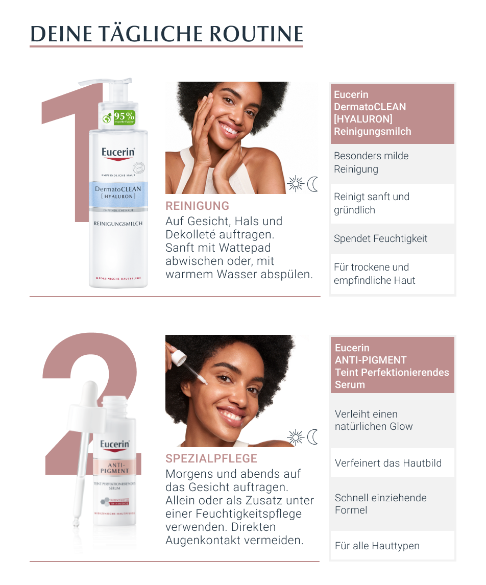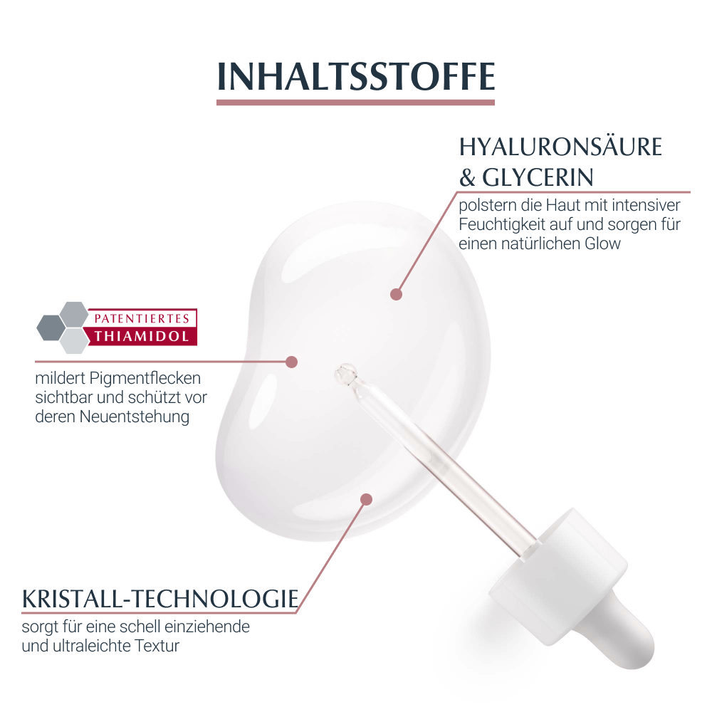 Das Eucerin Anti-Pigment Serum für einen perfektionierten Teint enthält langkettige Hyaluronsäure und Glycerin, wodurch die Haut mit Feuchtigkeit aufgepolstert wird. Zusätzlich wird der Haut so ein natürlicher Glow verliehen. Dank der Kristall-Technologie ist die Textur besonders schnell einziehend und leicht, sodass das Anti-Pigment Serum in jede Hautpflege-Routine integriert werden kann. Patentiertes Thiamidol® in dem Pigmentfleckenserum verleiht ein gleichmäßiges und strahlendes Hautbild. Erste Ergebnisse sind schon nach 2 Wochen Anwendung des Serums gegen Pigmentflecken sichtbar. Die gute Hautverträglichkeit und die Pflegewirksamkeit des Anti Pigmentflecken Serums sind klinisch und dermatologisch erwiesen.