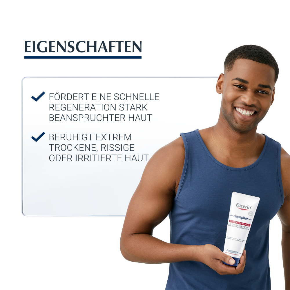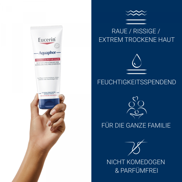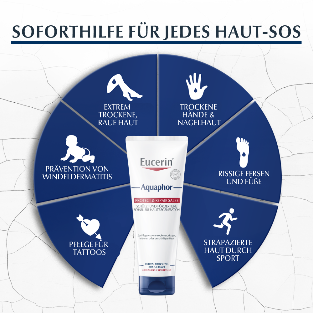 "Die Eucerin Aquaphor Repair Salbe wurde speziell für die Pflege von extrem trockener, rissiger und irritierter Haut entwickelt und unterstützt eine schnellere Hautregeneration.