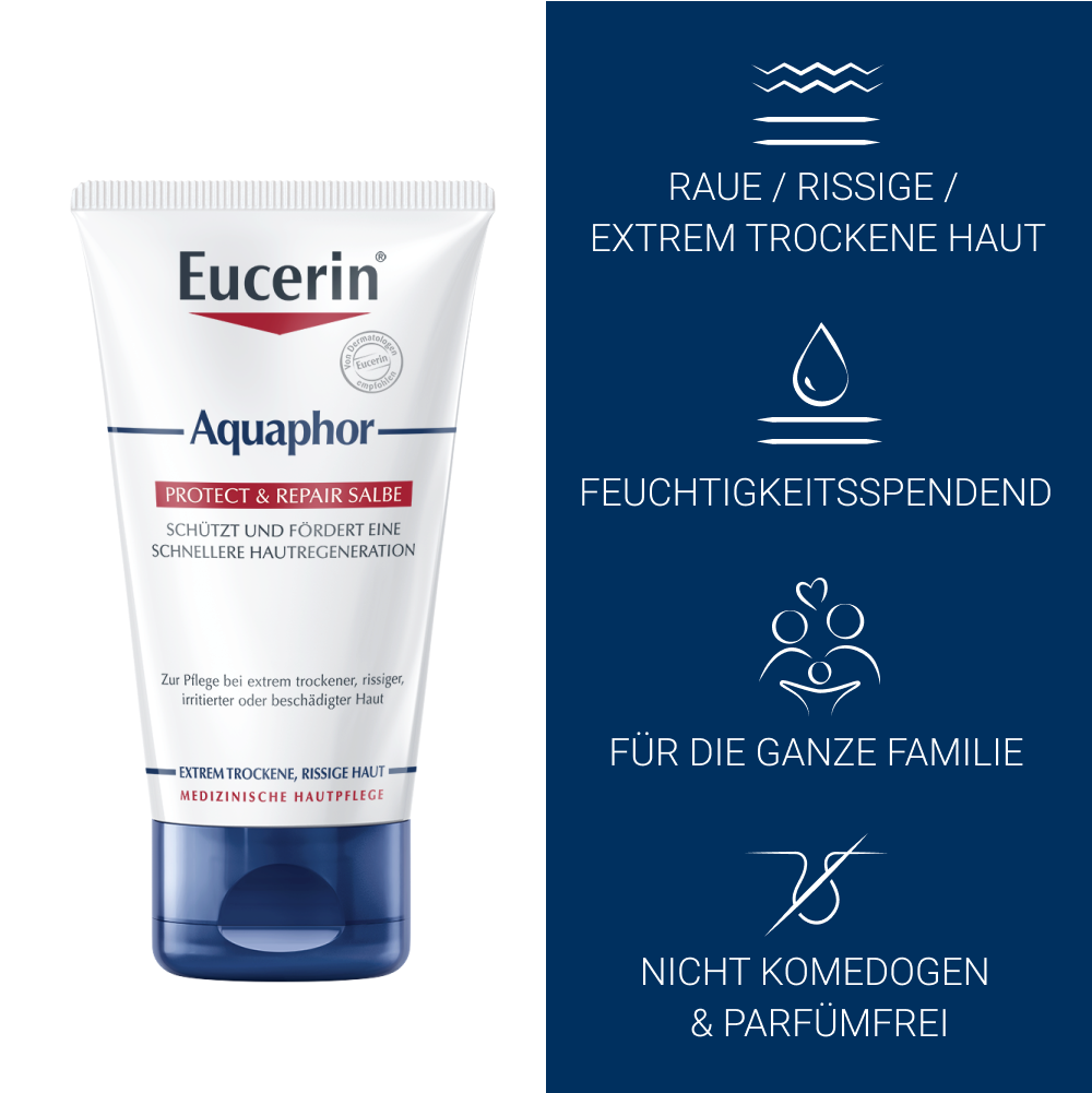 Aquaphor fördert die Ausbildung eines physiologischen Hautregenerationsmilieus, einer Art Schutzschild, um so die Barrierefunktion der Haut zu verbessern. Dies wird durch die wasserdampfdurchlässige (semi-okklusive) Formel erreicht, die einen schützenden Film auf der Haut bildet und einen möglichen Feuchtigkeitsstau verhindert. Zusätzlich wirkt die Repair Creme mit den Wirkstoffen Panthenol und Bisabolol beruhigend bei irritierter Haut.