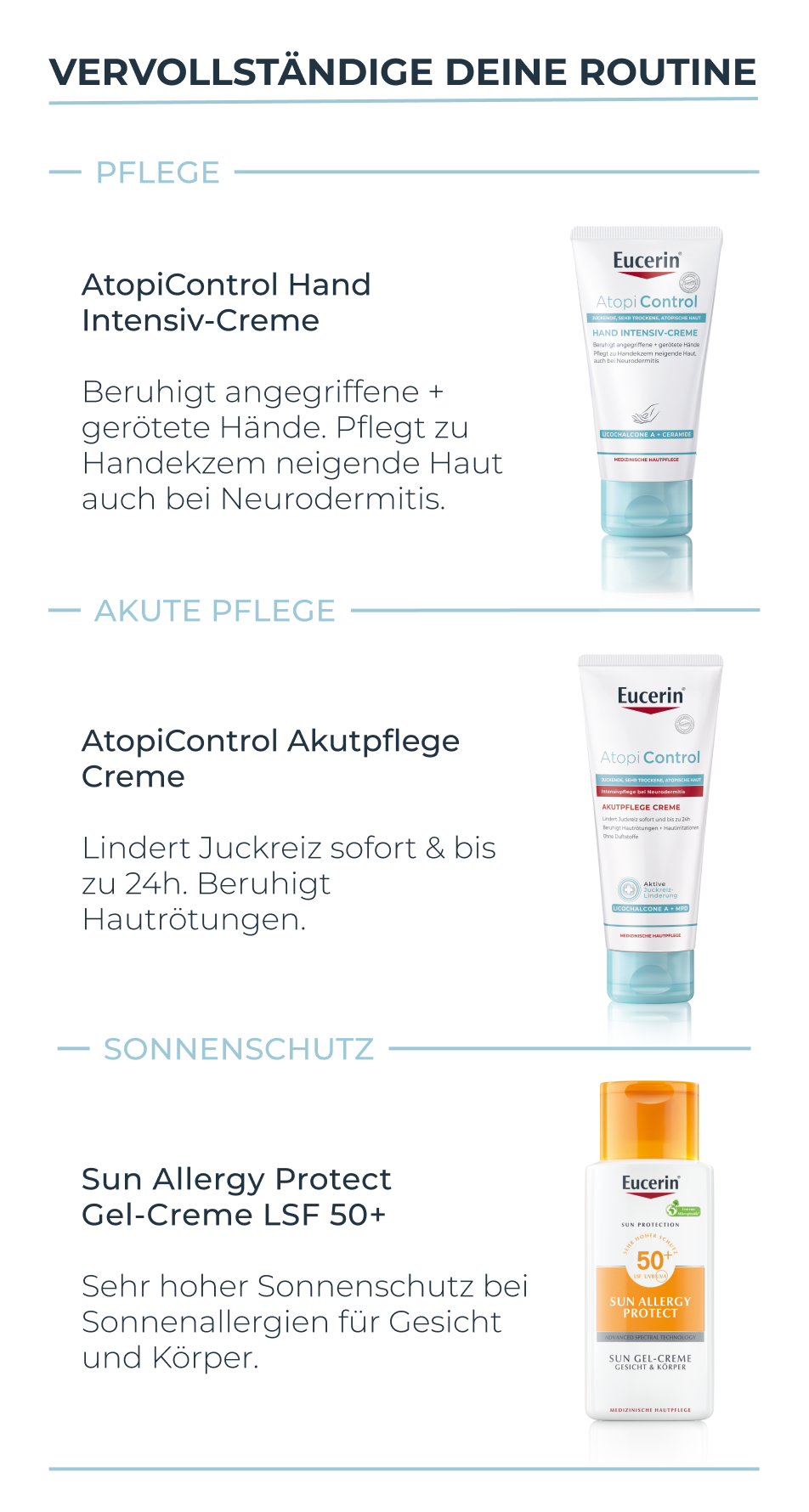 - Ergänzend kann das rückfettende AtopiControl Dusch- und Badeöl verwendet werden und in akuten Phasen die AtopiControl Akutpflege Creme