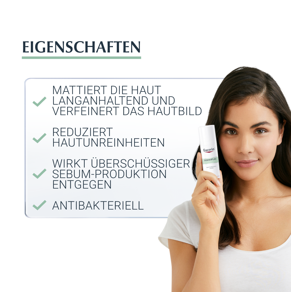 Das Eucerin DermoPure Mattierende Fluid hilft effektiv bei anspruchsvoller, unreiner, zu Akne neigender Haut und Pickeln. Außerdem können die Unreinheiten langfristig kontrolliert werden. Die Gesichtspflege kombiniert mehrere Inhaltsstoffe für ein reineres und mattiertes Hautbild: Salicylsäre reduziert Hautunreinheiten und beugt ihrer Neuentstehung vor, Licochalcone A beruhigt bei Hautirritationen und reduziert Gesichtsrötungen, die sebumregulierende Technologie hilft die überschüssige Talg-Produktion zu hemmen und mattierende Partikel sorgen für einen 8-stündigen Anti-Glanz Effekt, ohne die Poren zu verstopfen.