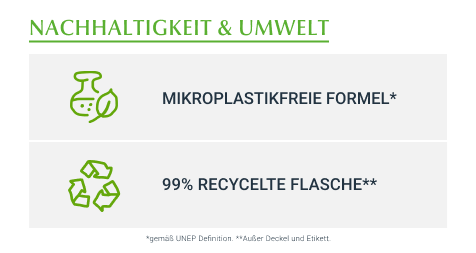 • Frei von Mikroplastik • 99% recycelte Flasche (rPET)